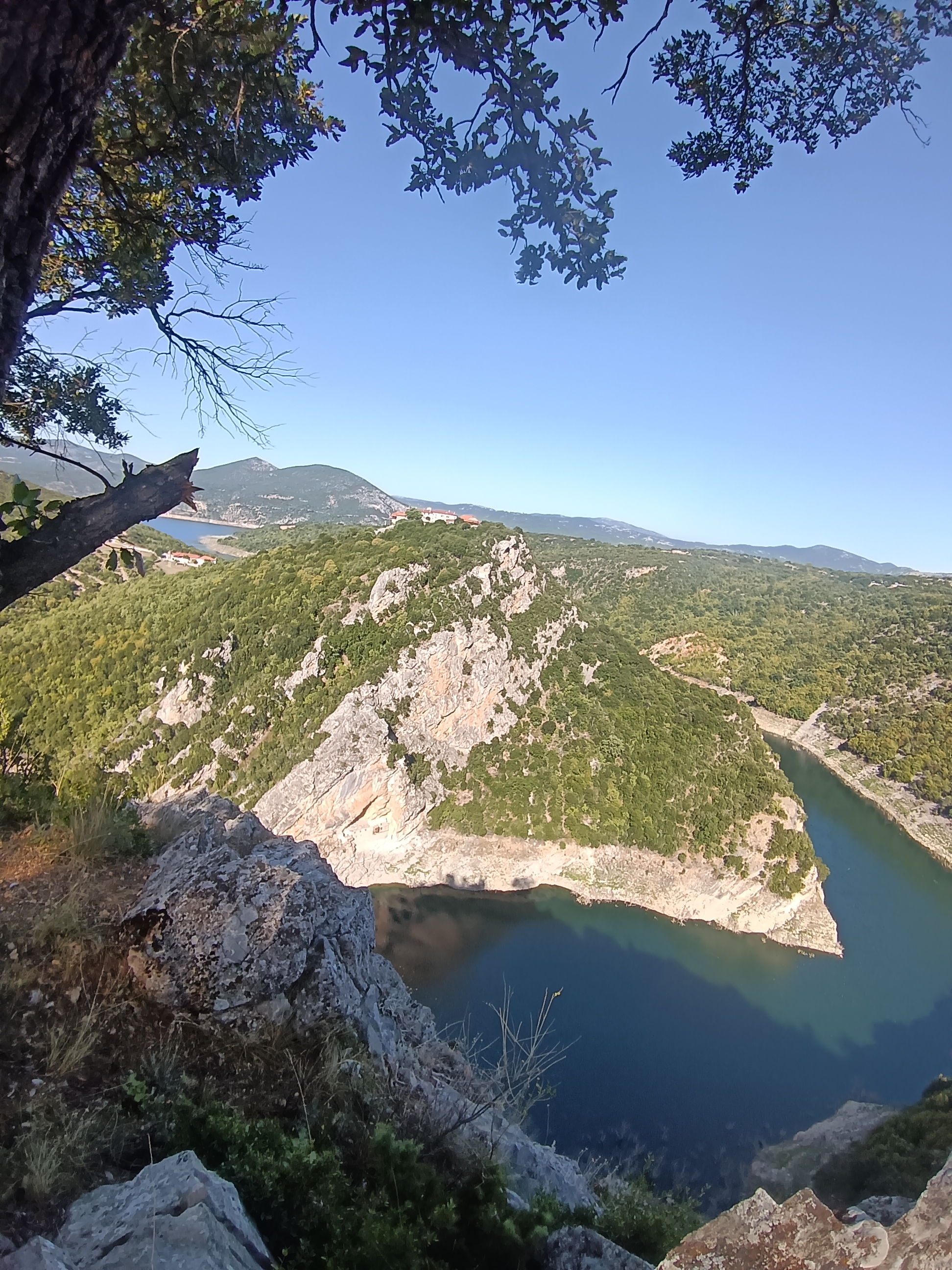 L’accès à ce lac étant un cul-de-sac, on revient sur nos pas, pour ensuite entamer la descente vers le sud. Prochain arrêt: le lac, naturel toujours, de Kastorias Orestiada, et sa presqu’ile sous forme de montagne. On poursuit une centaine de kilomètres à travers des petites routes de moyennes montagnes jusqu’au canyon du fleuve Haliacmon. Là, on prend une chemin rocailleux pour atteindre la falaise qui fait face au beau monastère de Saint-Nikanor. Plus loin vers le sud encore, le monastère, à l’abandon, de l’Annonciation de Panagia Bounasia. On quitte la route pour une quarantaine de kilomètres de chemins de montagnes, variés, entre cailloux et fech-fech piégeux, pour naviguer sur le plateau qui domine lorsqu’on parvient à sa fin les célèbres monastères des Météores, alors que le soleil se rapproche de l’horizon. Tel était le but: parvenir ici au-dessus des pitons rocheux sur lesquels ont été érigés ces monastères, par une voie différente de celle empruntée par les bus de touristes, et à une heure où la fréquentation a largement diminué. Soirée à Kalambaka, la ville en contrebas.