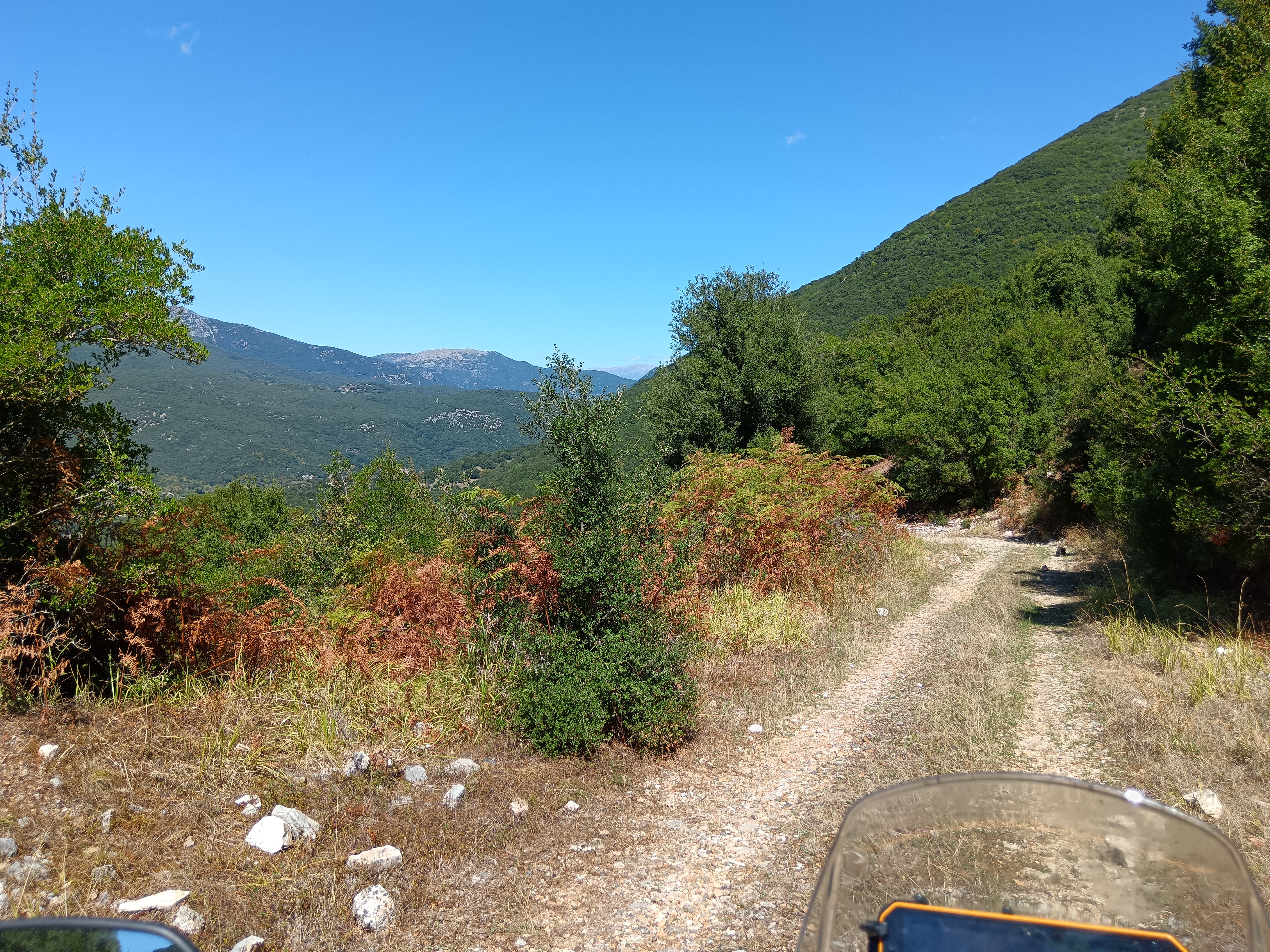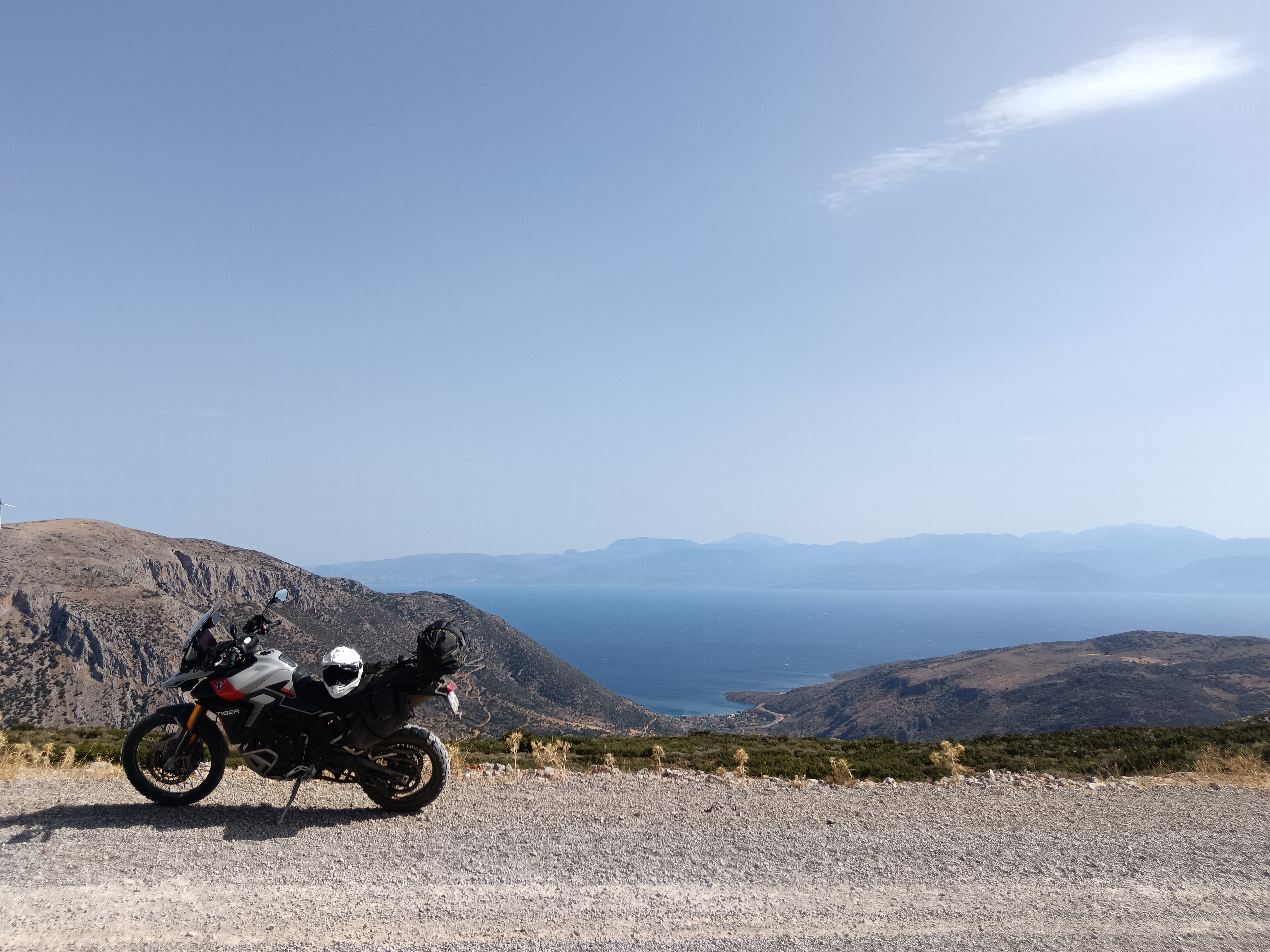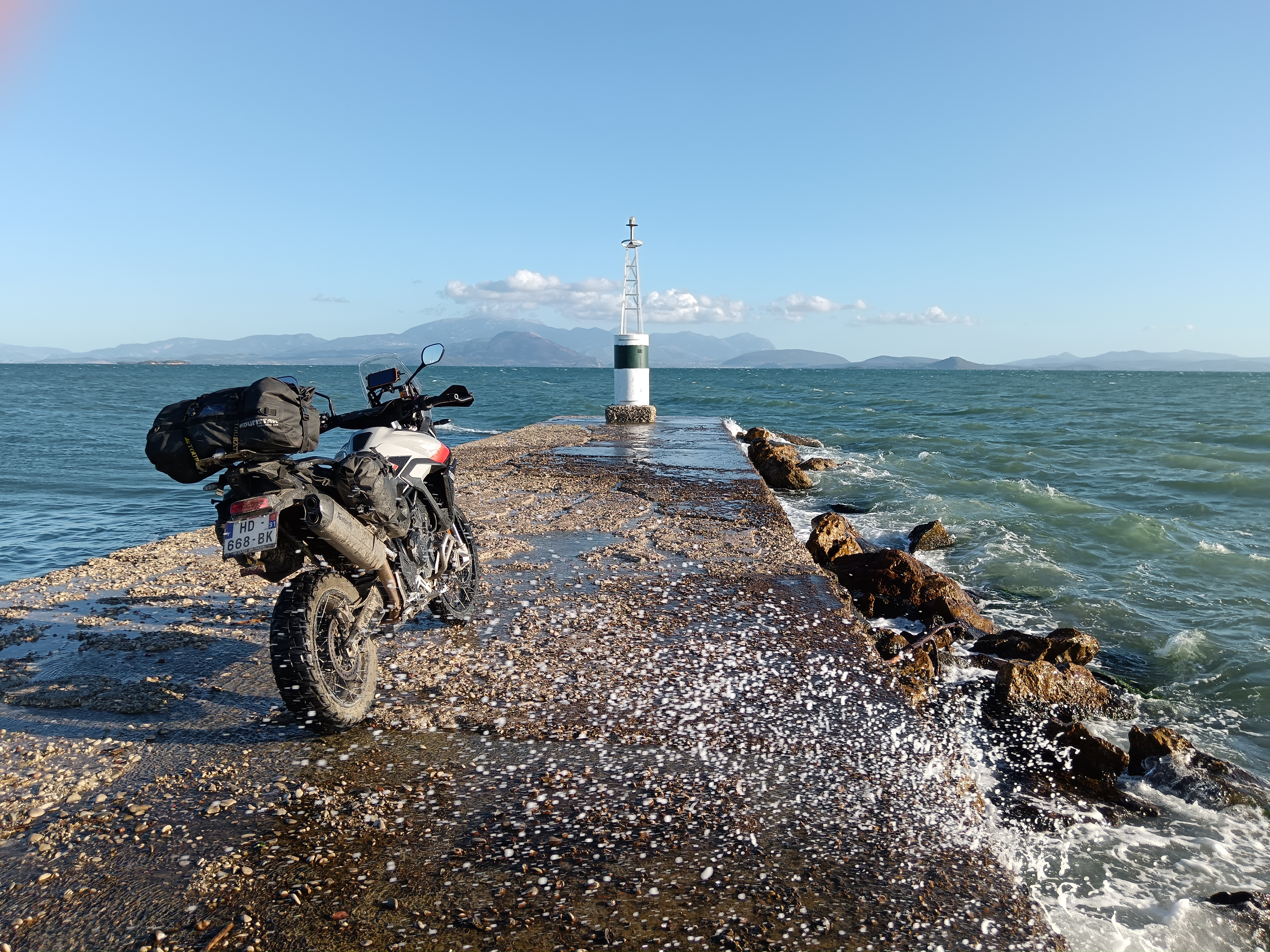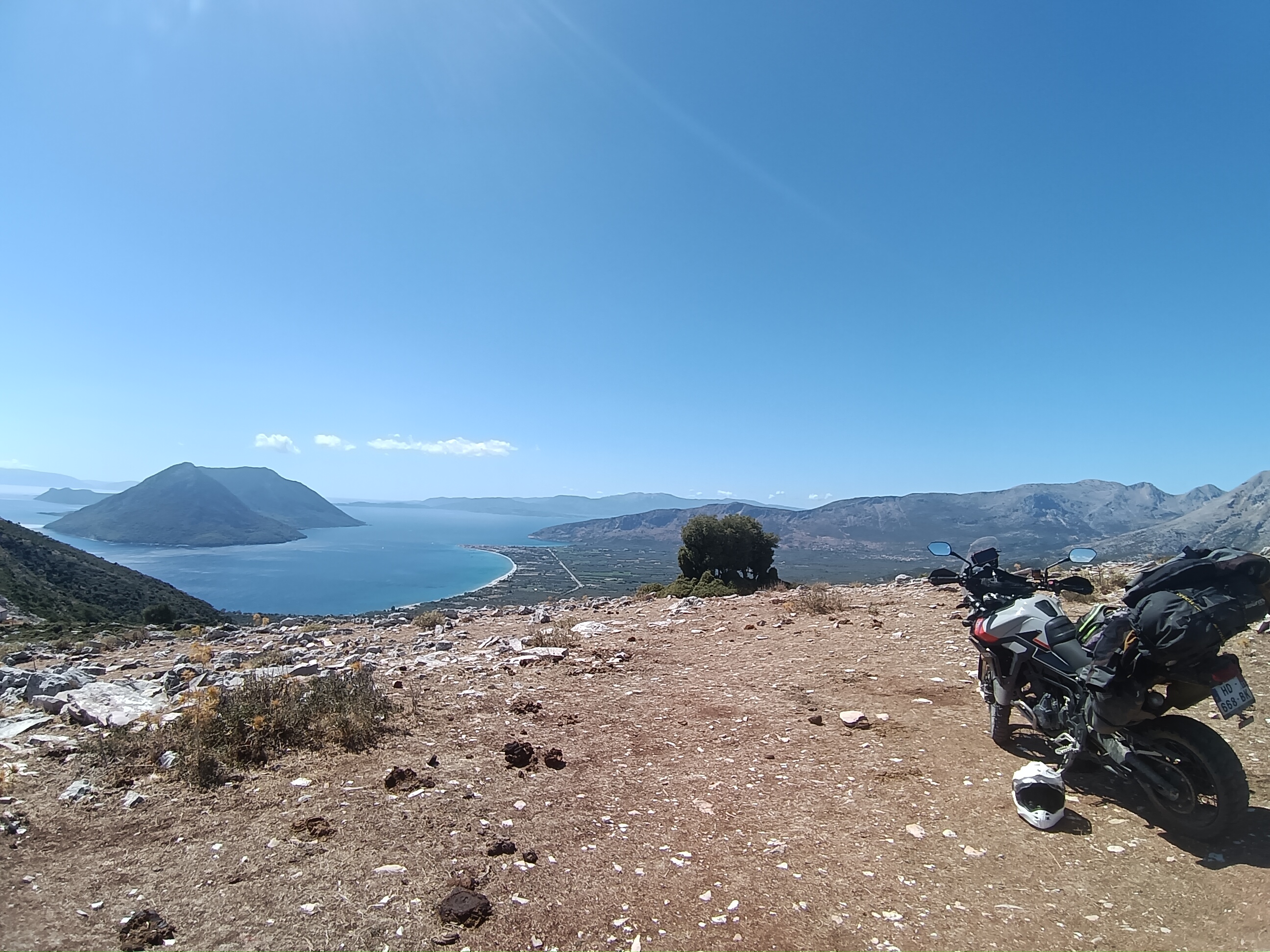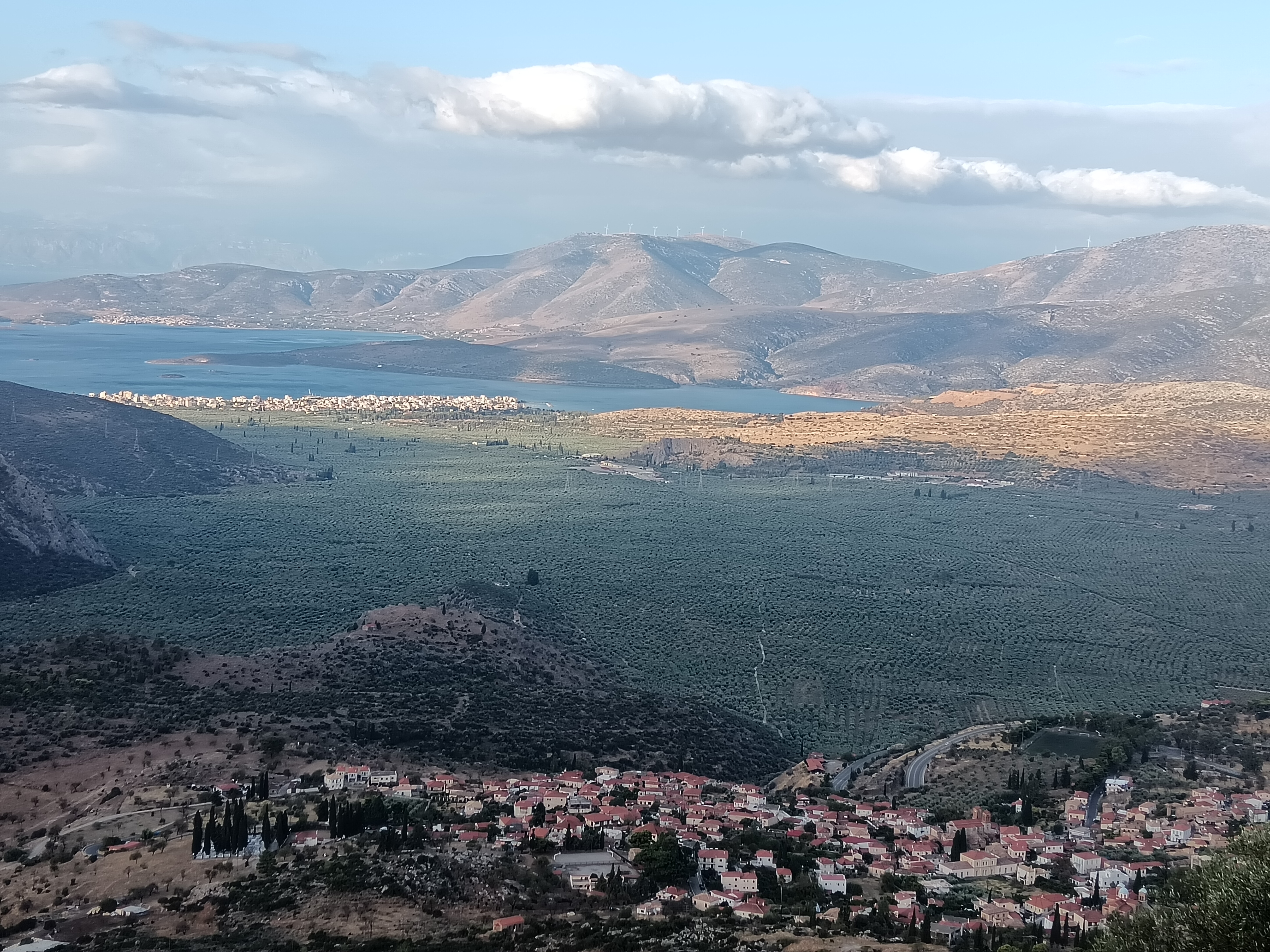 On poursuit à travers ces pistes et paysages de montagne, jusqu’à ce que, au sommet d’un col, environ à 1200m d’altitude, s’ouvre devant vous un panorama extraordinaire sur le golfe de Corinthe, sous vos pieds (mordus). Une des plus fortes sensations de roulage, après ces forêts denses et ces pics rocheux gris, d’un coup le bleu de la Méditerranée sous vos pieds. On se laisse descendre jusqu’au bord de l’eau, avant de traverser une vaste étendue d’oliviers, et remonter vers l’un des lieux très attendus de ce voyage: le site archéologique de Delphes.