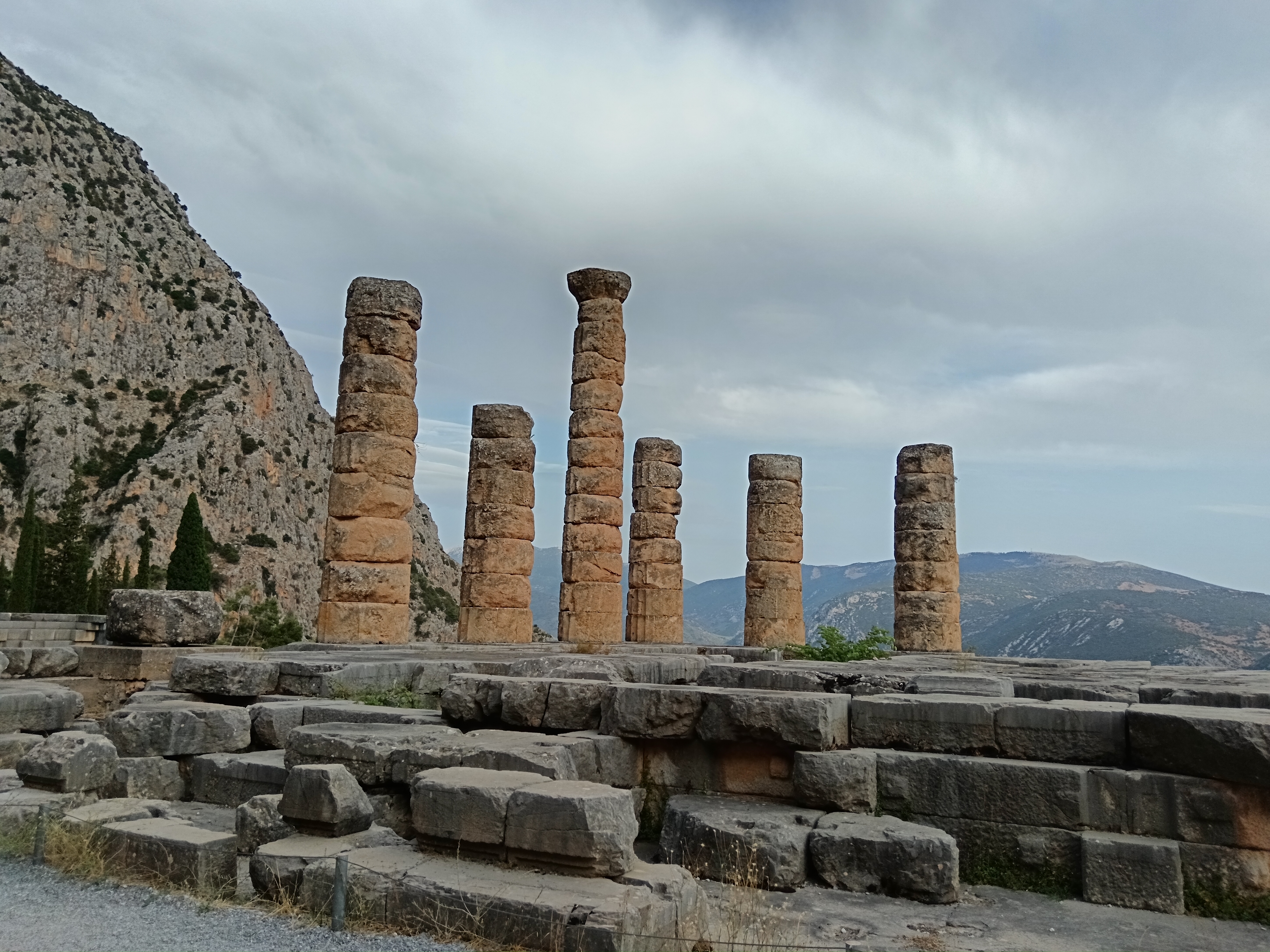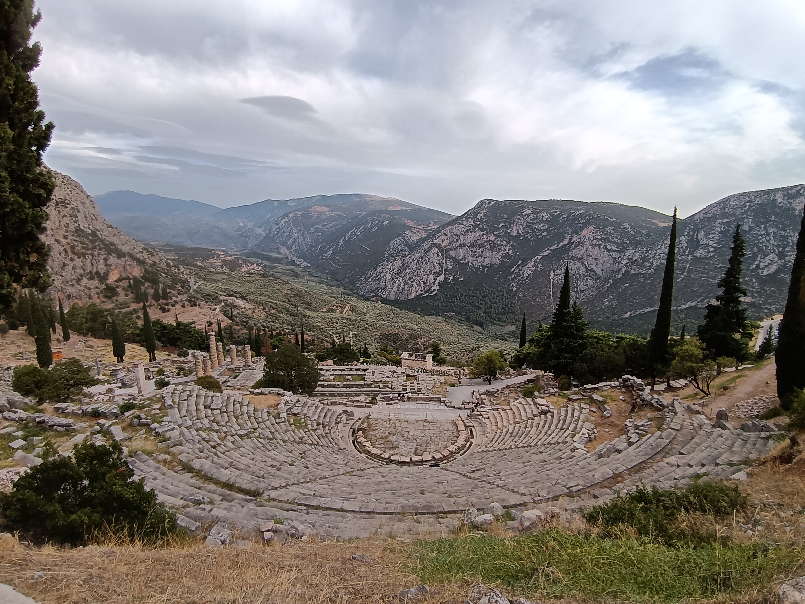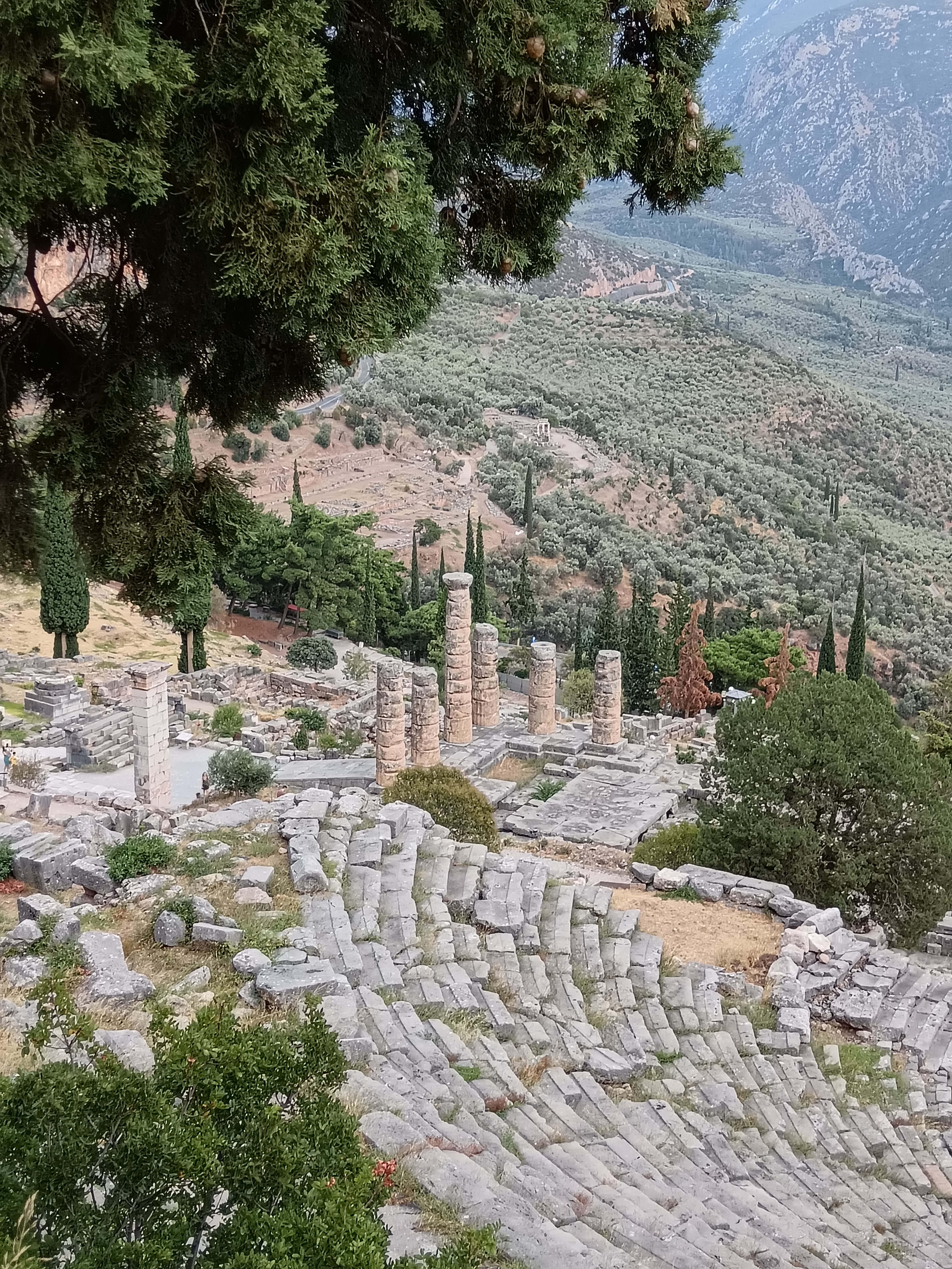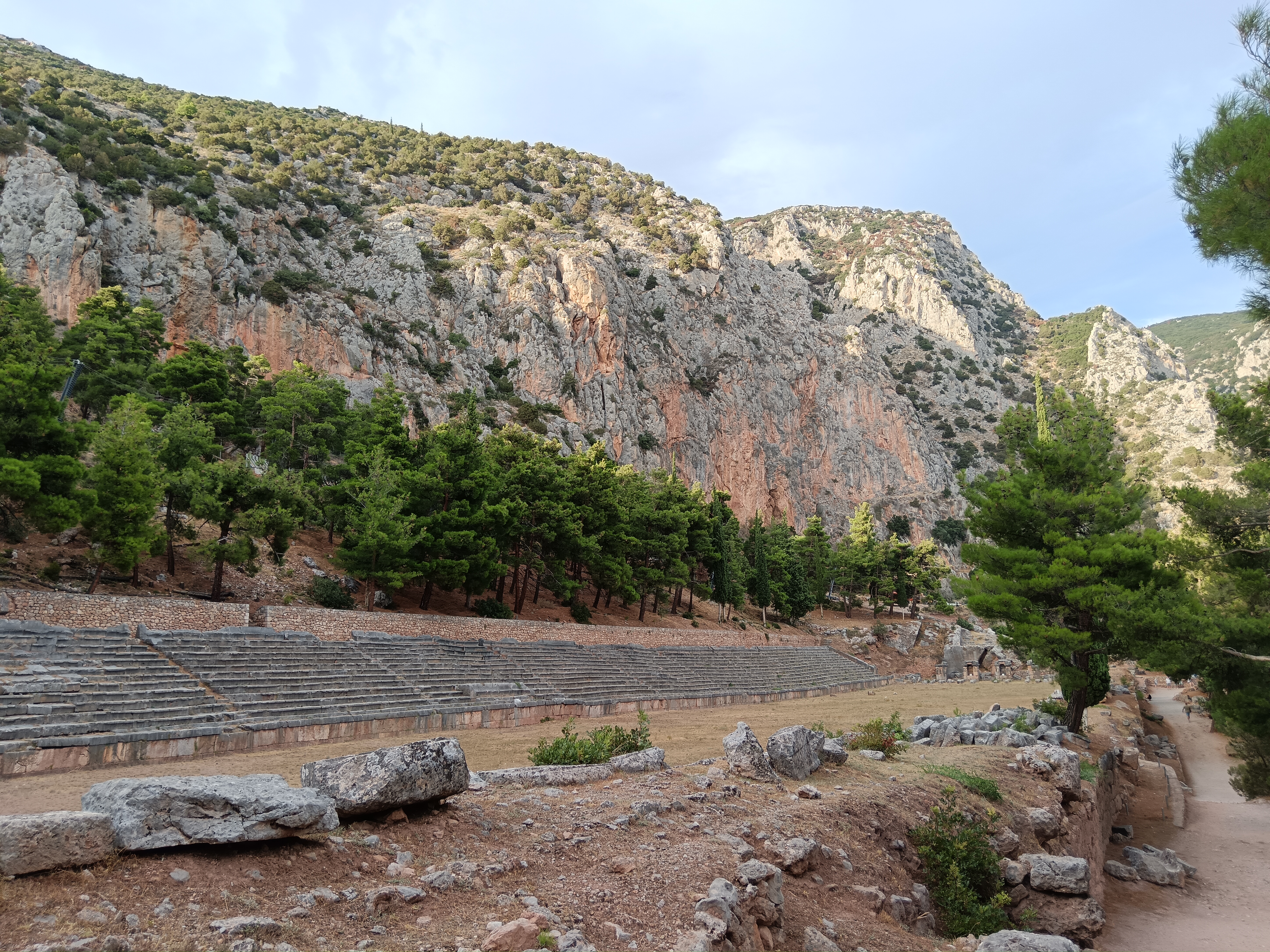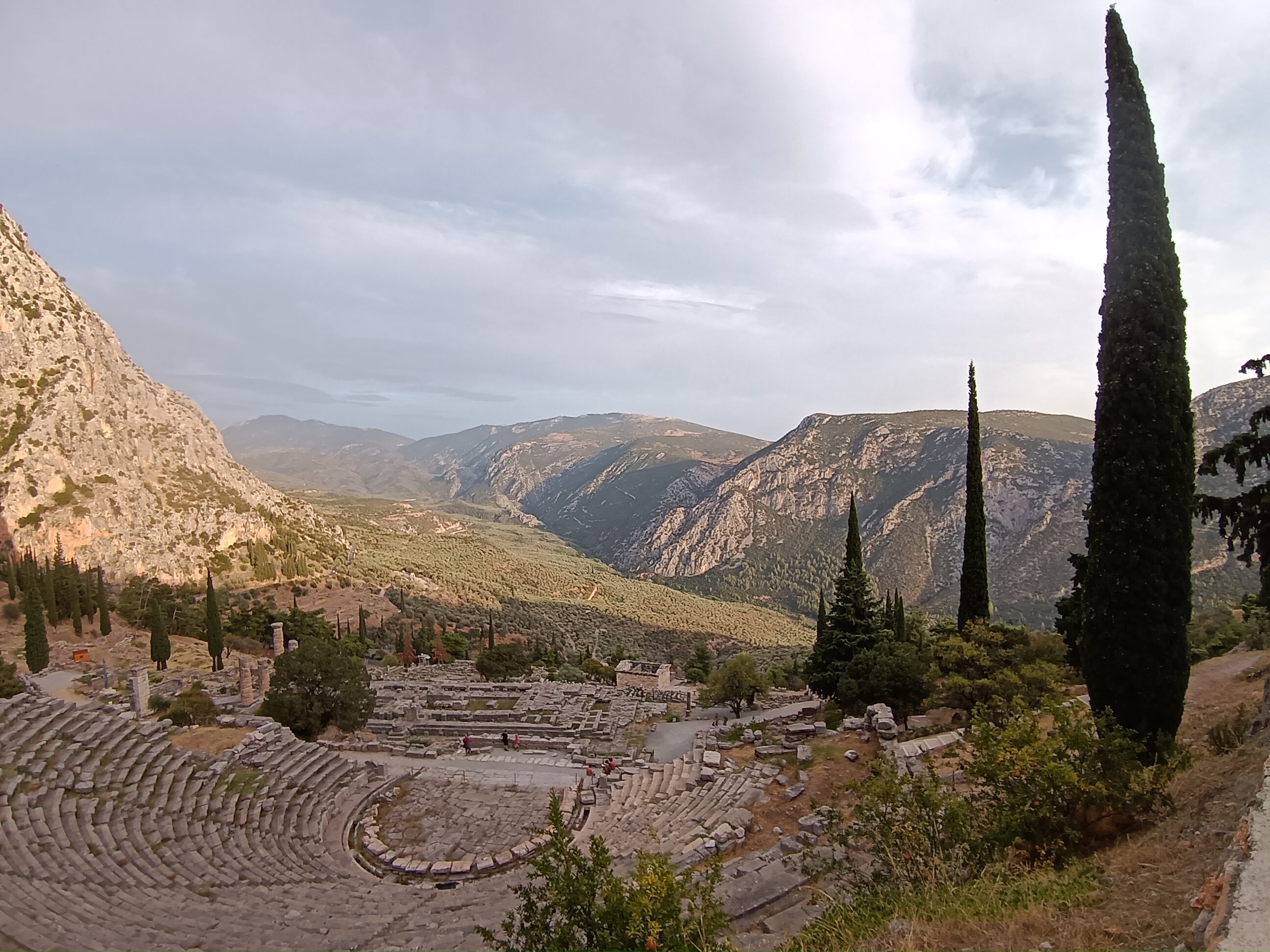 Il n’est que 17h30, le site ferme à 20h. Stationnement de la moto à l’hôtel, douche, ravitaillement en eau, et nous voilà parti pour arpenter l’ensemble du site archéologique durant deux heures, sur des pentes raides, sans aide motorisée cette fois, à la force des mollets. Une claque intertemporelle !! Le temple d’Apollon, l’amphithéatre, le stade. Une claque visuelle !! Ce site suspendu à flanc de montagne, à 600m au-dessus de la Grand Bleu en contrebas. Certes, les collègues se demandent toujours si je serai bien là pour la rentrée. Mais ils oublient qui aura mis le premier les pieds dans un amphi.