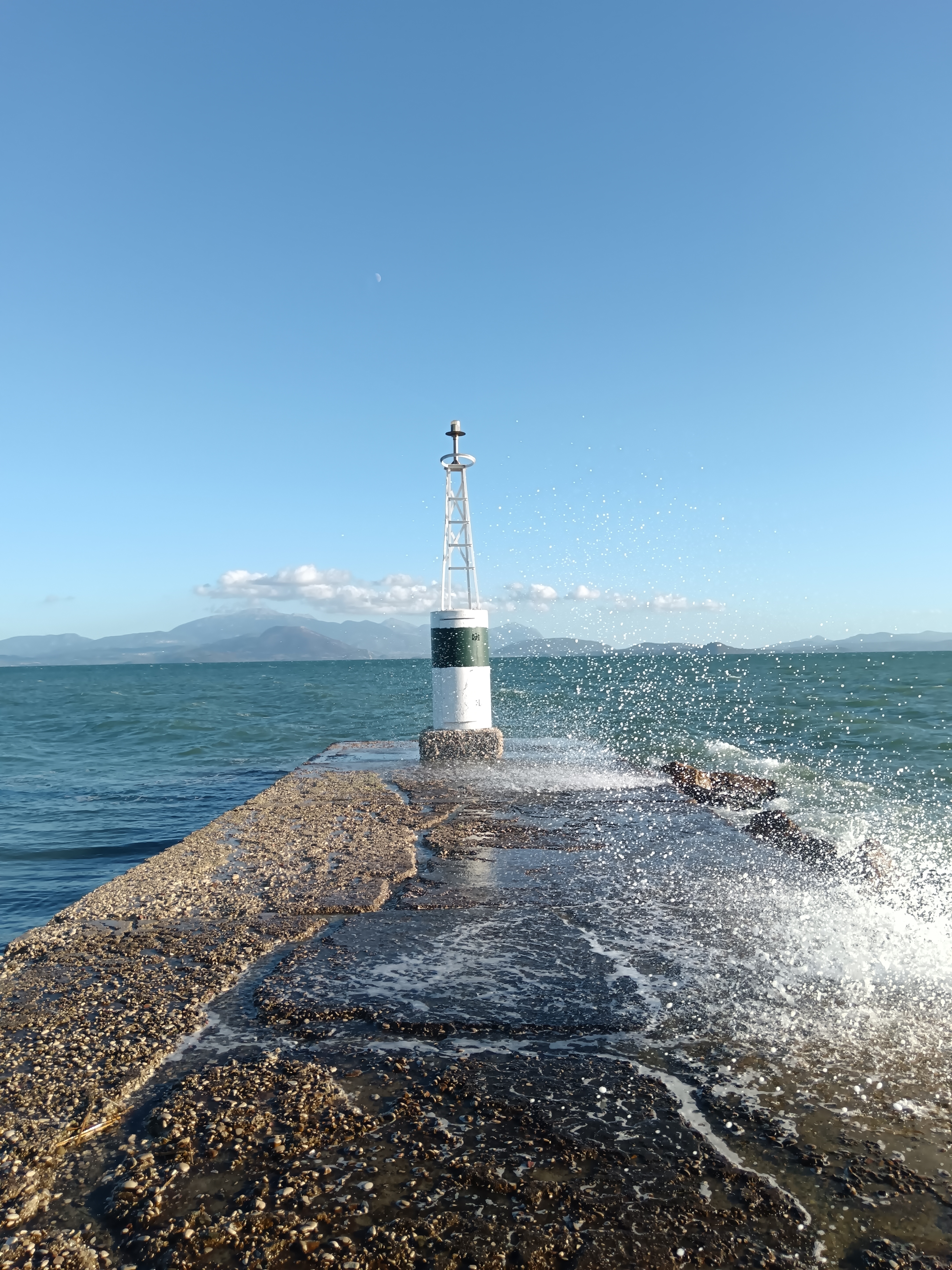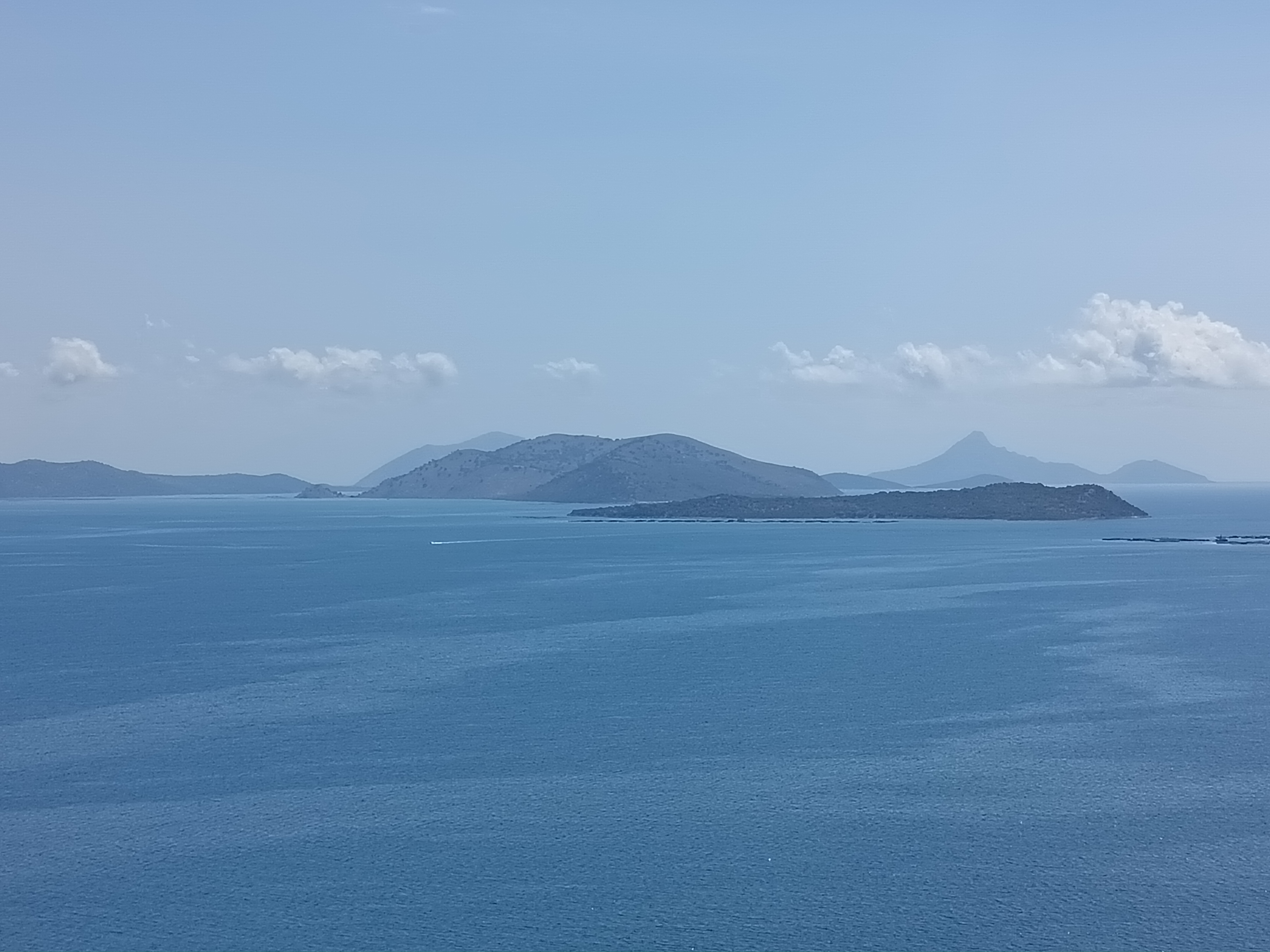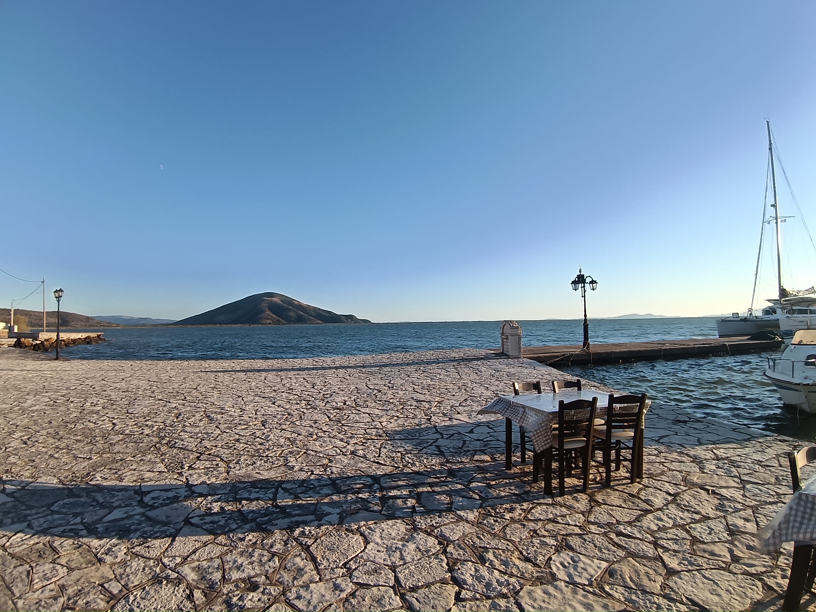 Une journée sur le thème du bleu. Cap vers l’ouest, alors que nous sommes le plus au sud du périple, le long du golfe de Corinthe. On roule le long de la mer, entre dans de petits villages de pêcheurs, jusqu’à l’impressionnant pont qui permet de connecter les deux rives du golfe au niveau de la ville de Patras. Mais nous préférons poursuivre encore vers l’ouest, la partie sud de la Grèce sera pour un prochain périple. On parvient dans une sorte de Camargue grecque au niveau de l’étonnante ville de Aitoliko, cernée par les eaux, et dont le point culminant doit se situer à 5cm. On retrouve plus loin le paysage montagneux avec une route de corniche durant environ une centaine de kilomètres remontant vers le nord le long de la mer ionienne. Arrêt déjeuner circuit court au port du village de Astakos. Depuis le départ 17 jours plus tôt, une seule baignade, en Croatie. Faute, erreur, à corriger. J’ai repéré en amont du voyage trois ou quatre endroits que j’imagine peu fréquentés. J’en teste un, 3 personnes. Photos et je repars. J’en teste un autre, en empruntant une piste descendante durant trois kilomètres, peu recommandable en voiture ordinaire. Mer turquoise, cailloux blancs, des iles en face (sinon, ça serait pas une baignade en Grèce). Seul (on est déjà le 31 aout). Deux heures de baignade et bronzette.