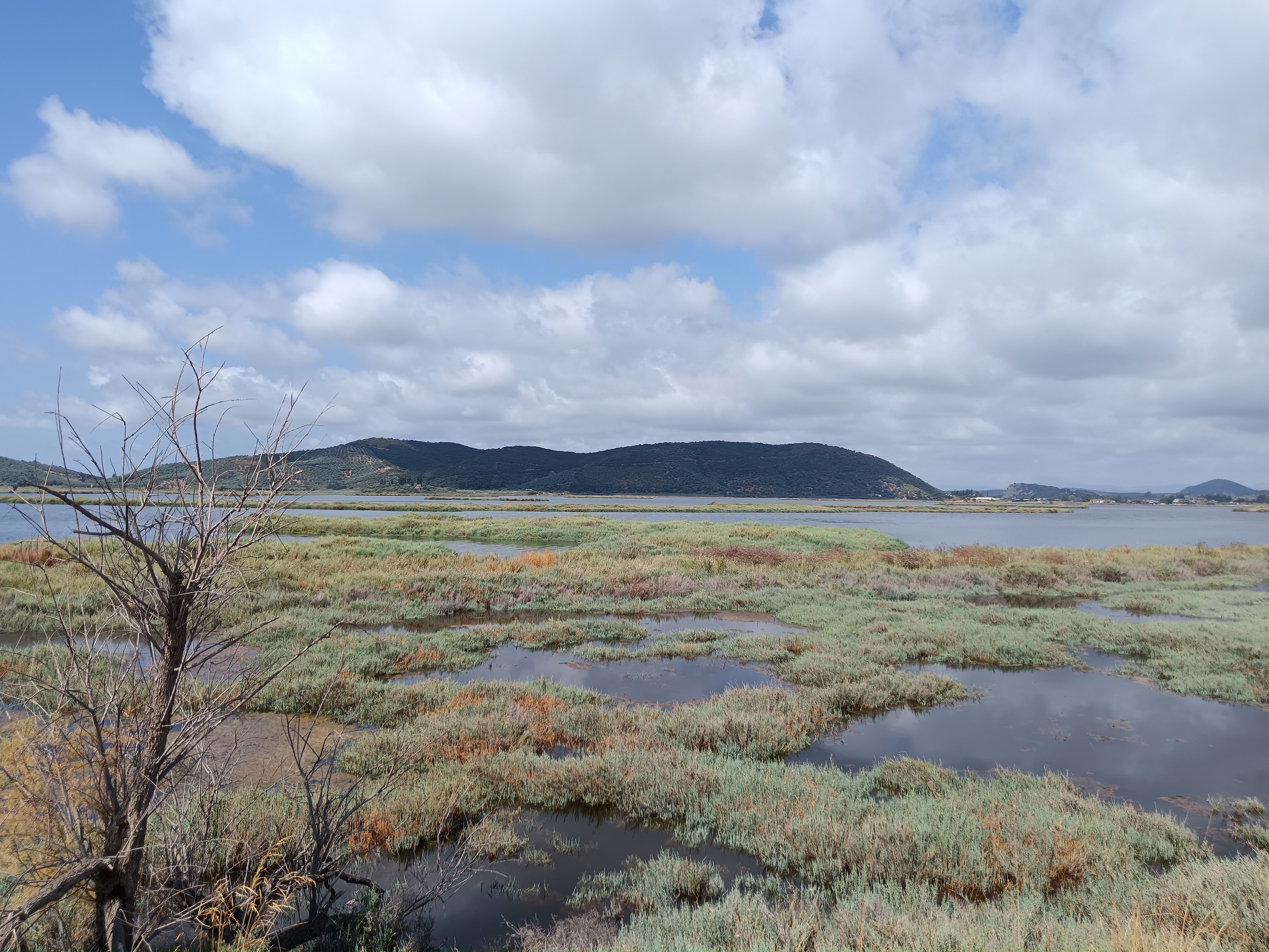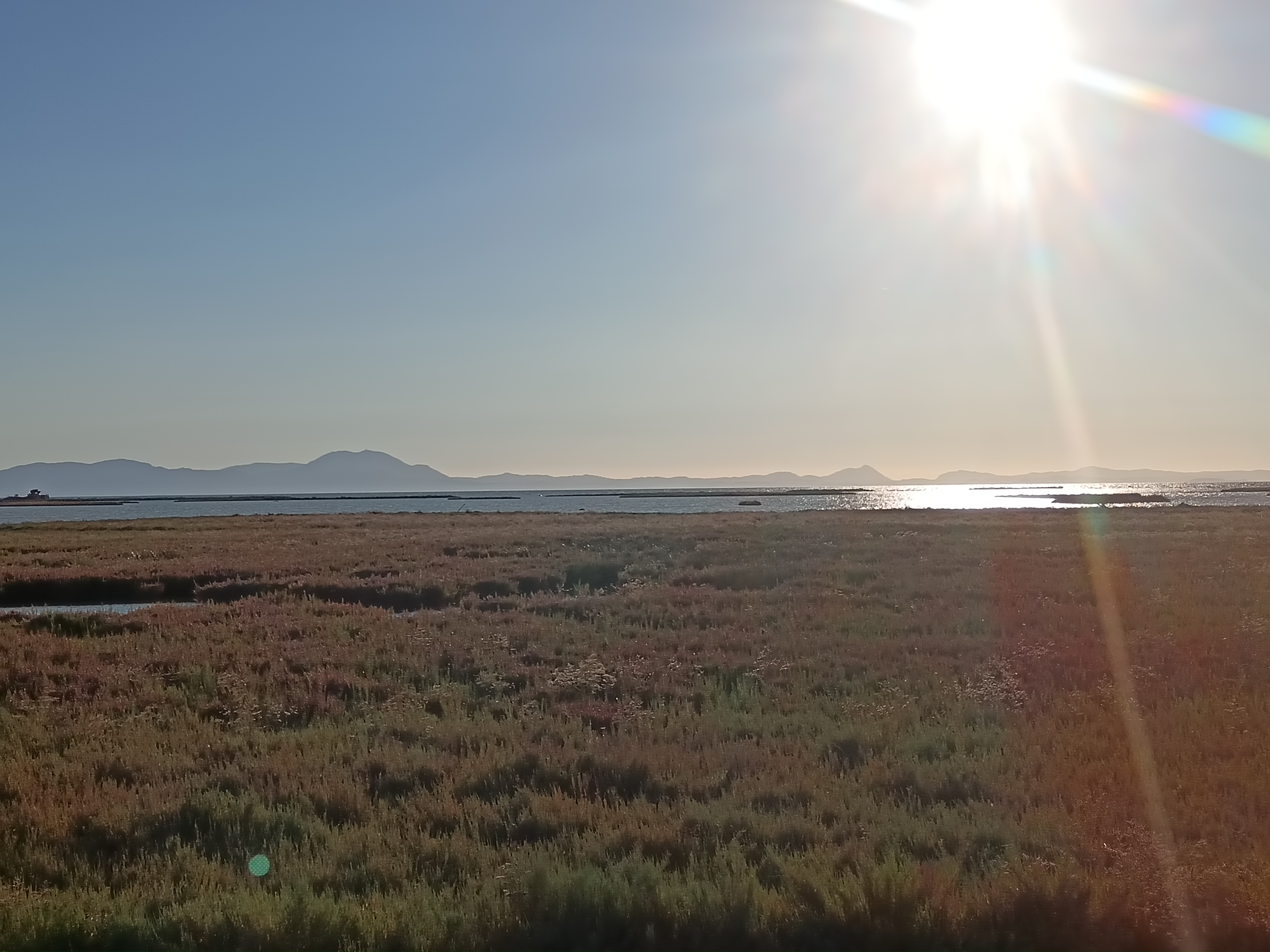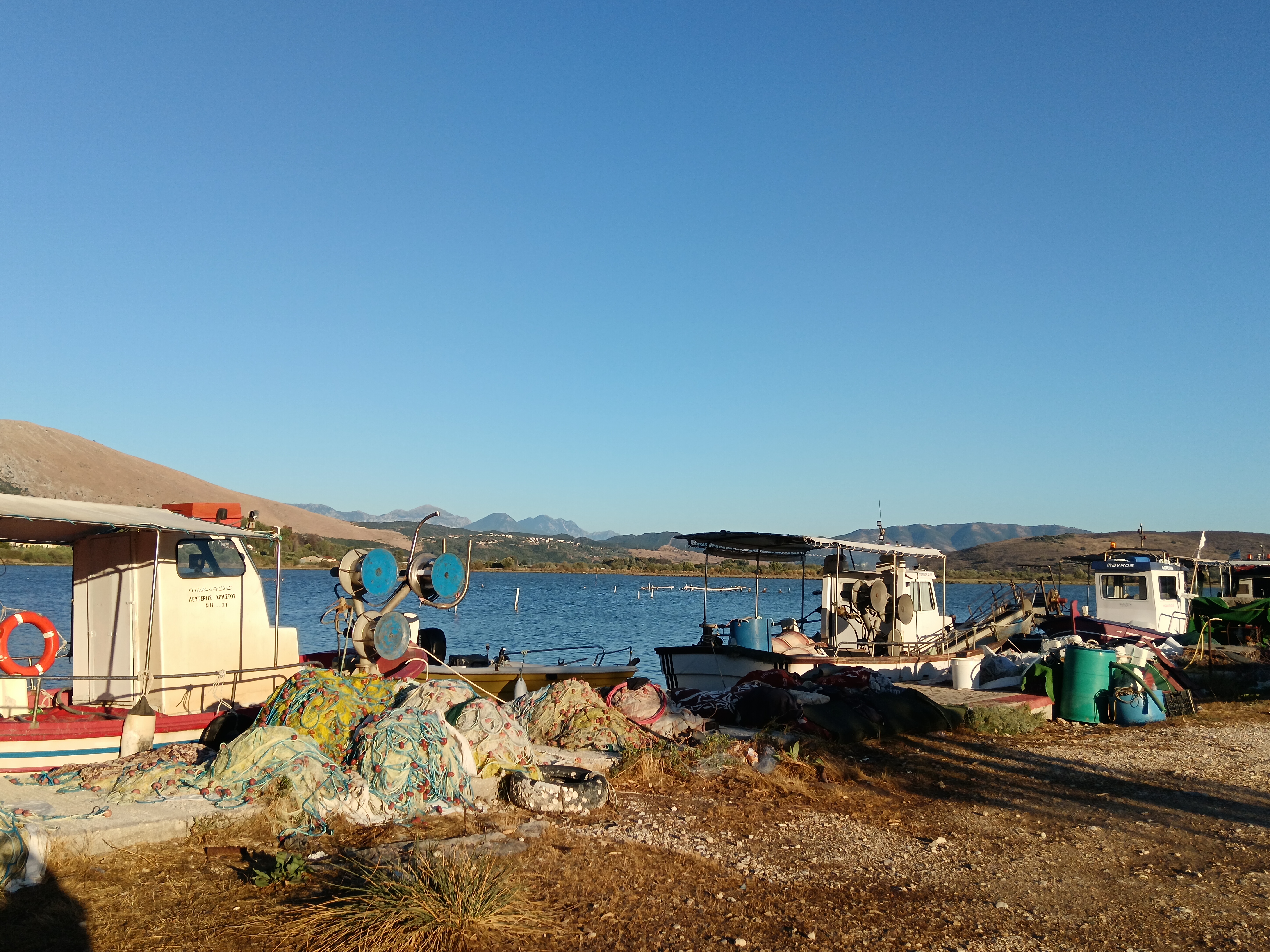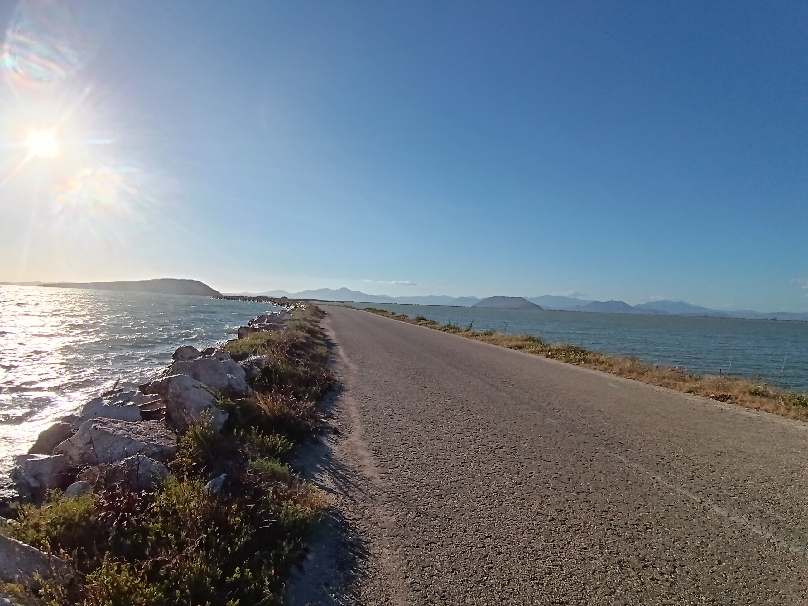On repart toujours vers le nord, pour atteindre, au bout de 50km de côte et 50km de terres intérieures, le golf ambracique, sorte de mer intérieure peu profonde, d’une couleur magnifique. Sur sa partie nord, le golfe abrite le parc national de la zone humide de Amvrakikos. Un magnifique zone humide que je parcours par de petites routes et pistes durant une cinquantaine de kilomètres et qui se termine par un village de pêcheur que l’on atteint au bout d’un étroit ruban de bitume de 5 km de long directement bordé des deux côtés par l’eau. Cette zone est un parc dans le parc: la zone zoologique de Salaora. Evidemment, tout était calculé: il fallait arriver là au coucher du soleil. Il ne me reste plus qu’à rebrousser chemin pour atteindre en début de nuit la ville moyenne de Apta, et y gouter à nouveau quelques spécialités grecques (même si contrarié par l’absence de bière grecque dans l’échoppe sélectionnée, compensée par un bon vin local).