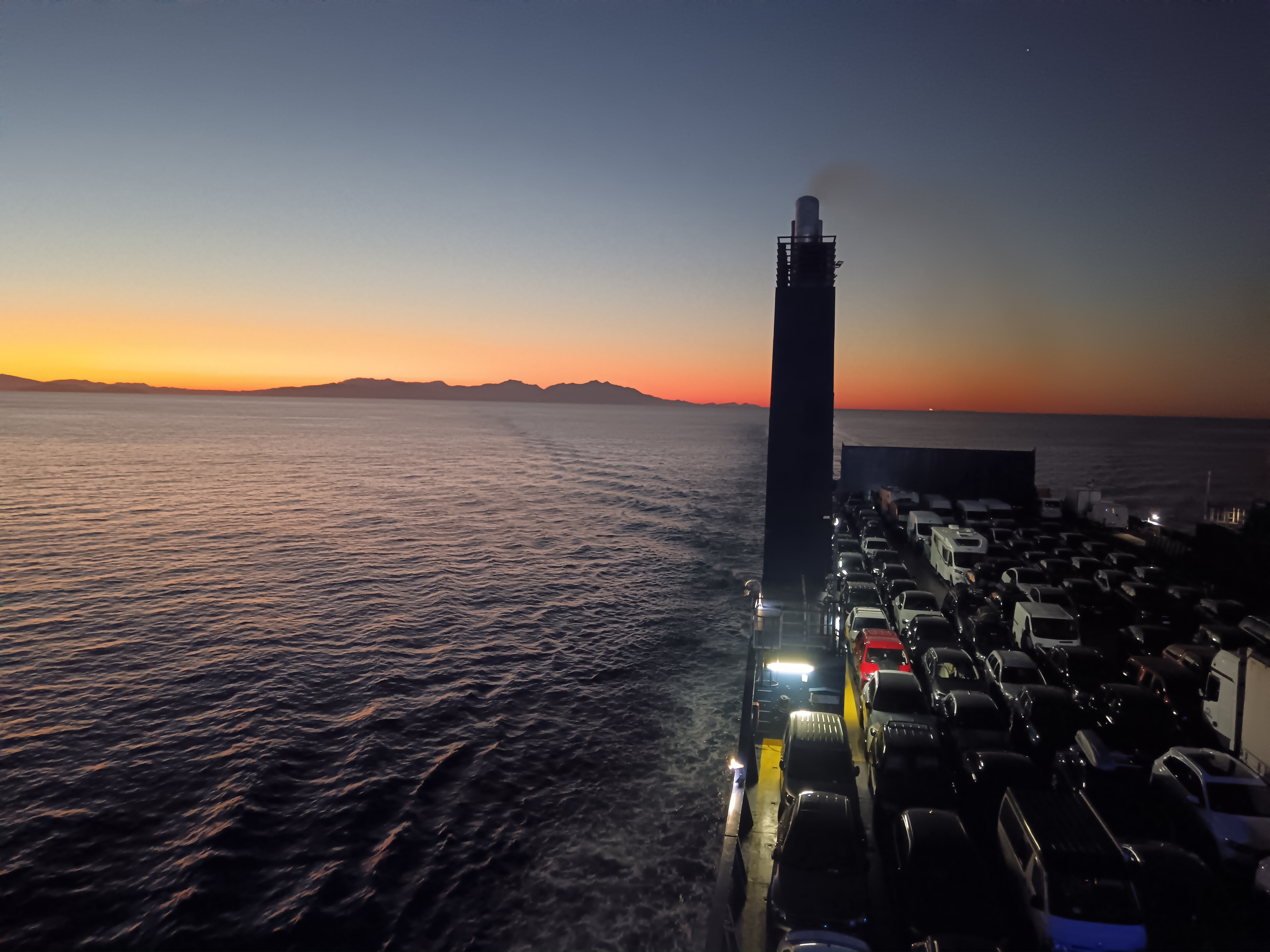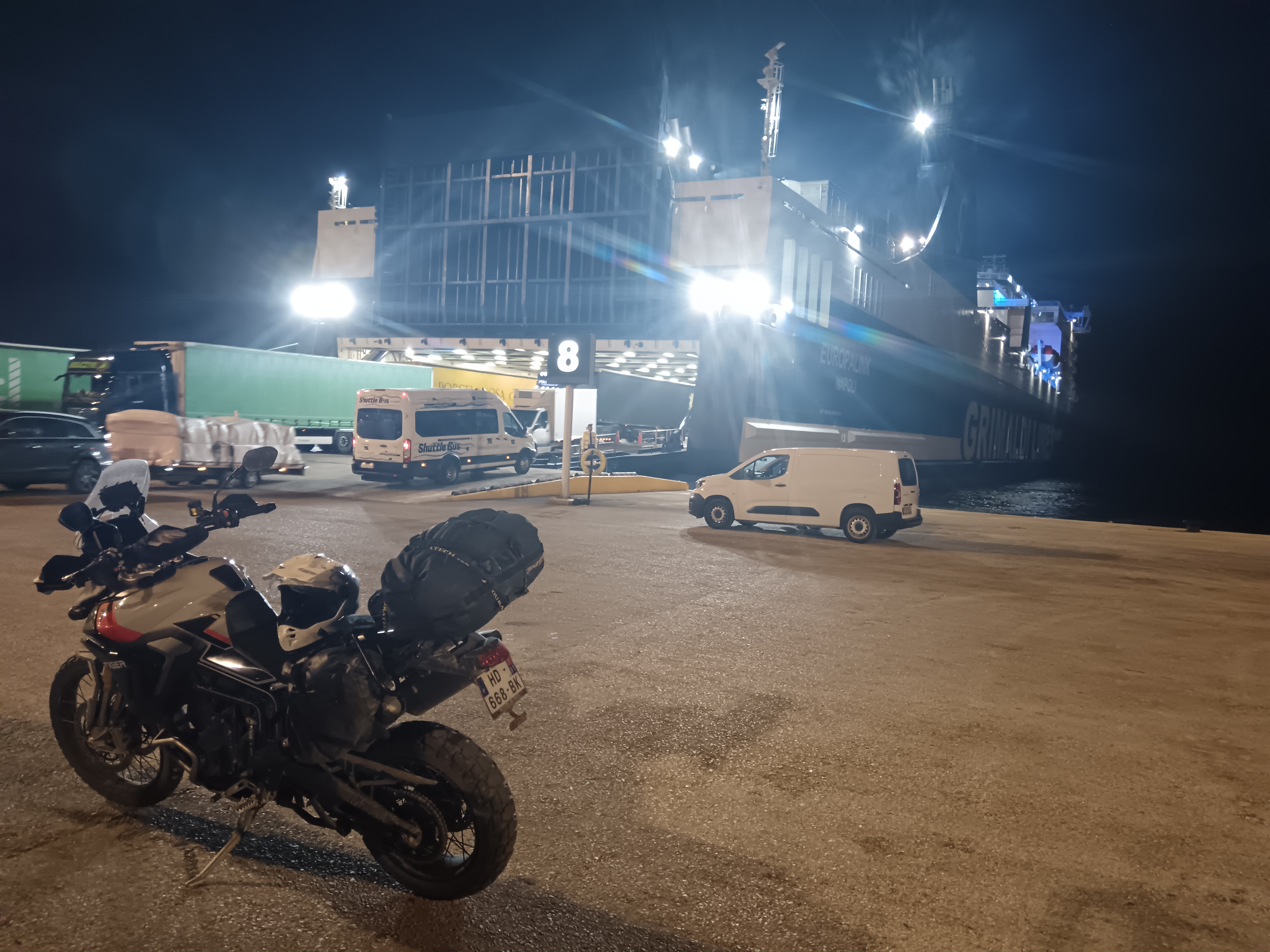 22h, nuit noire, le port d’embarquement se situe à 25km. Je m’y rends. Une heure allongé à même le sol à regarder 200 camions se faire avaler par le ferry, des douaniers fouillant chaque essieu pour verifier la présence de clandestins. J’avais oublié les tristes réalités du monde.