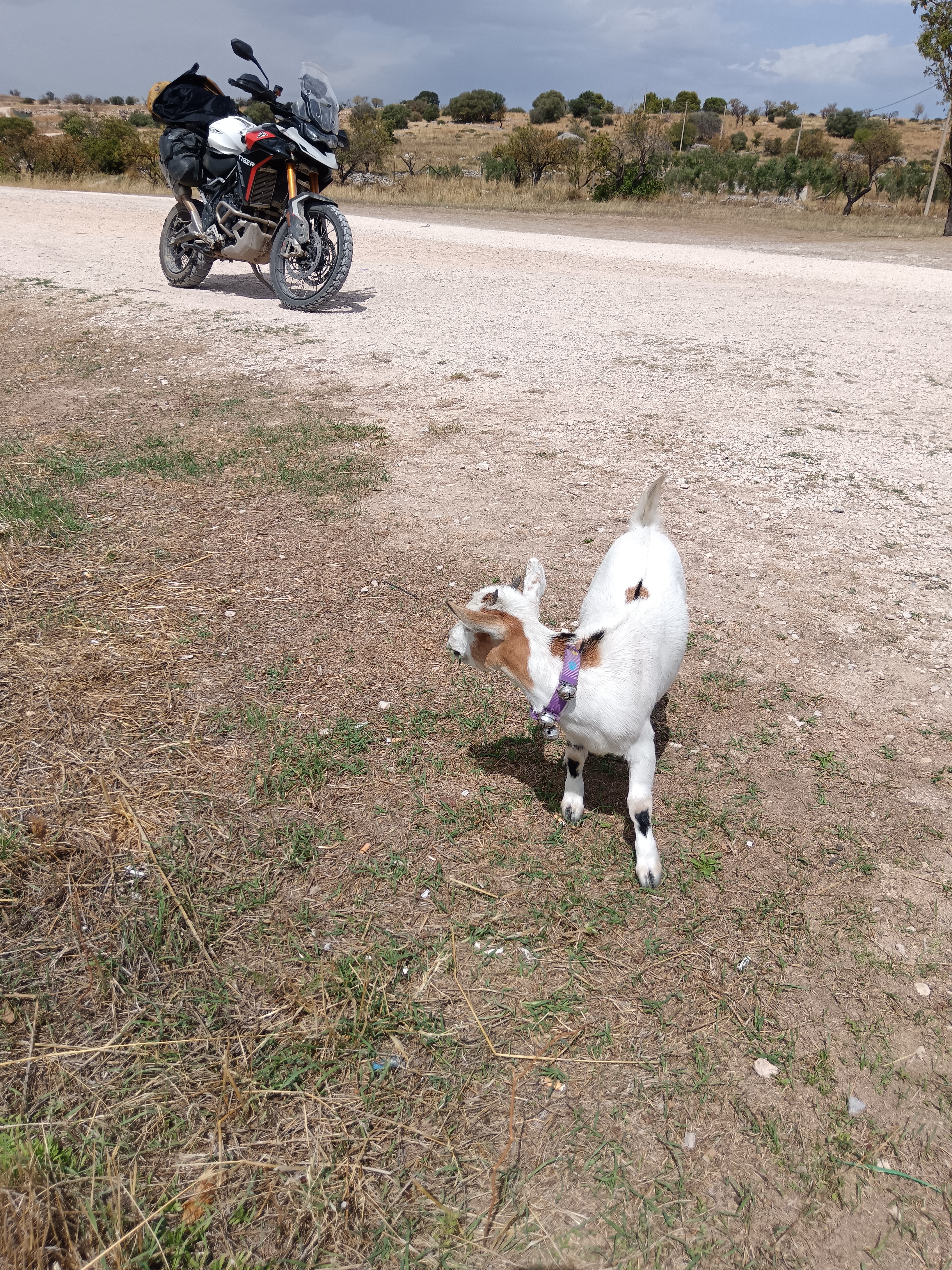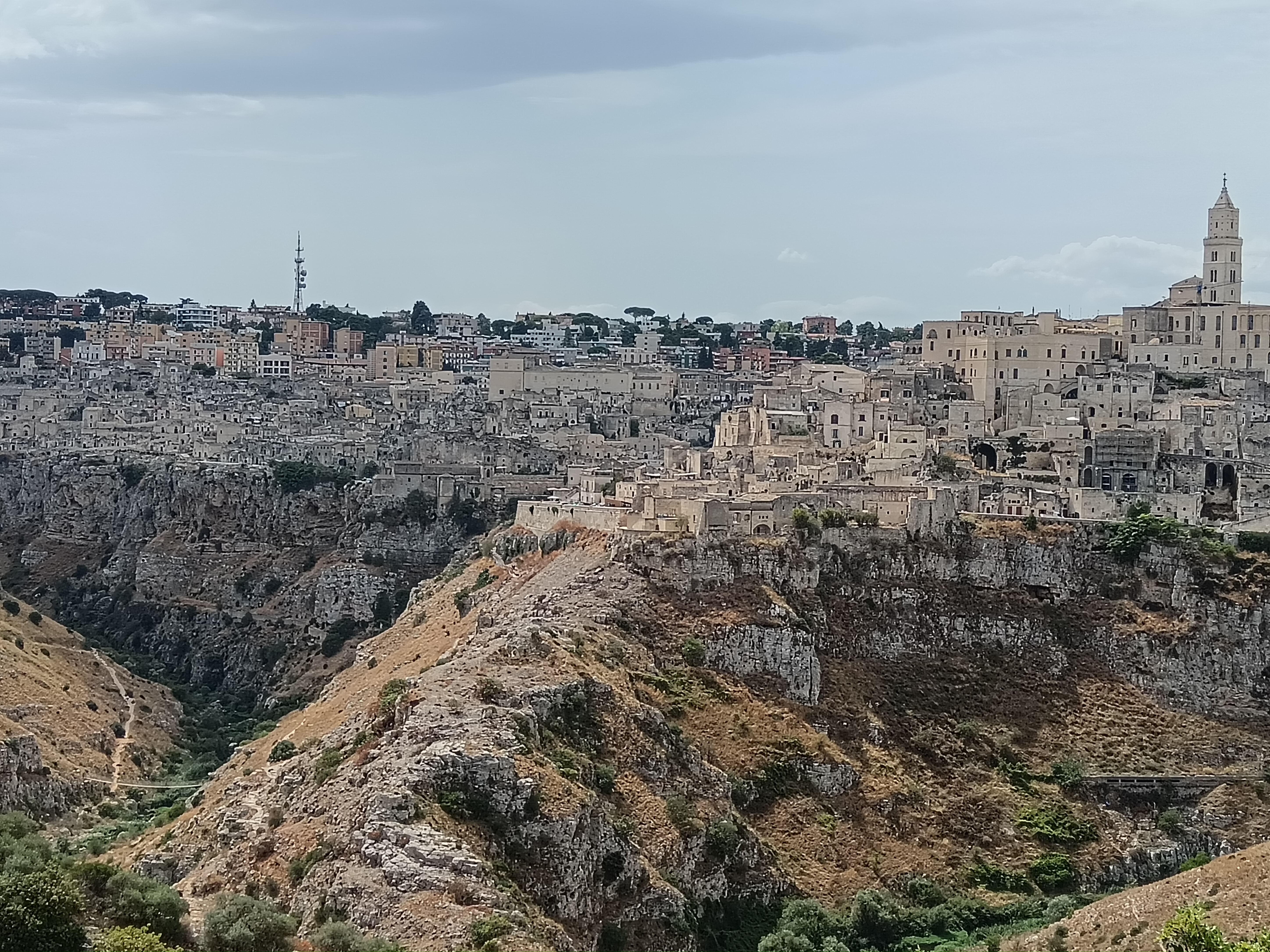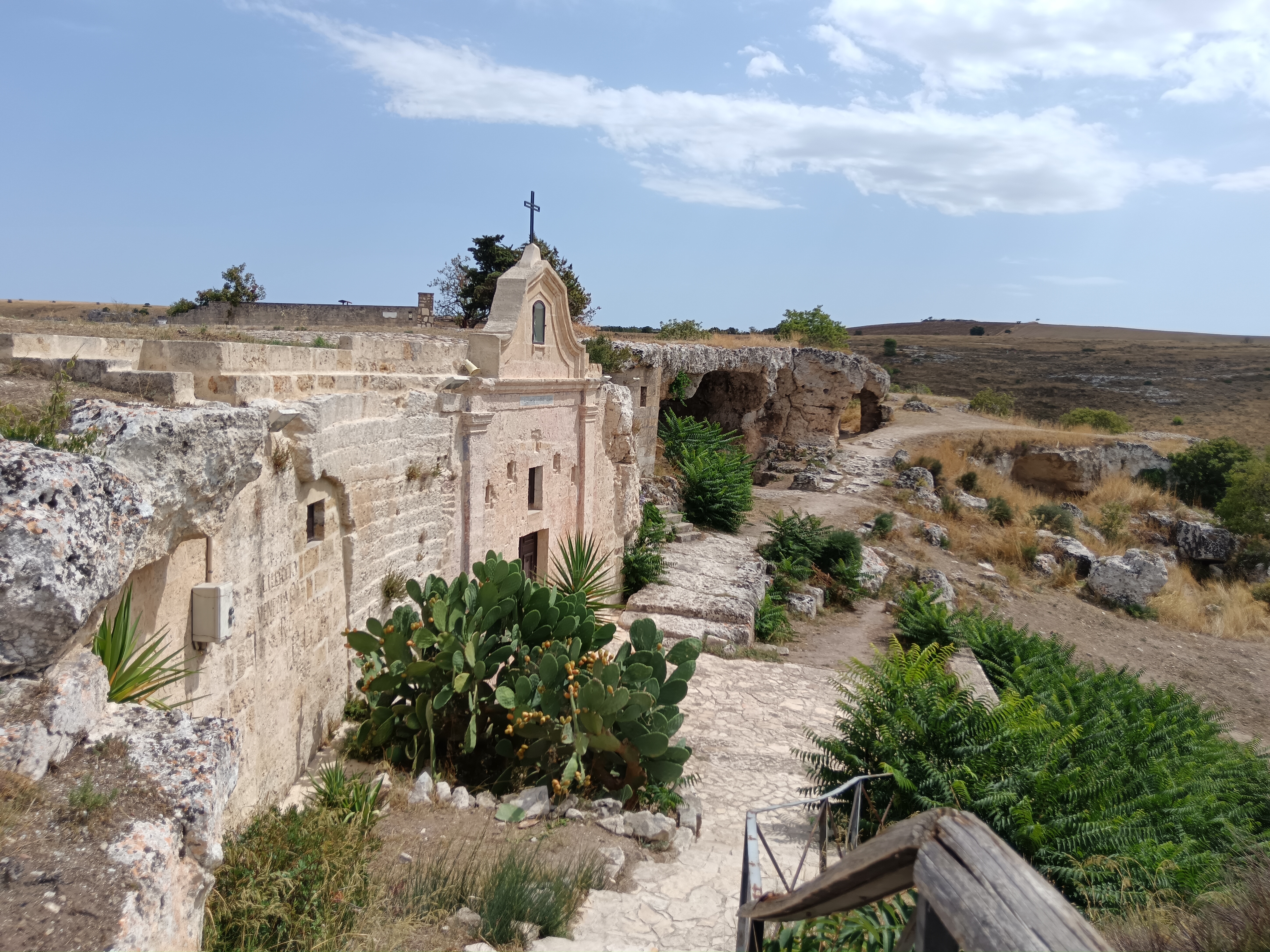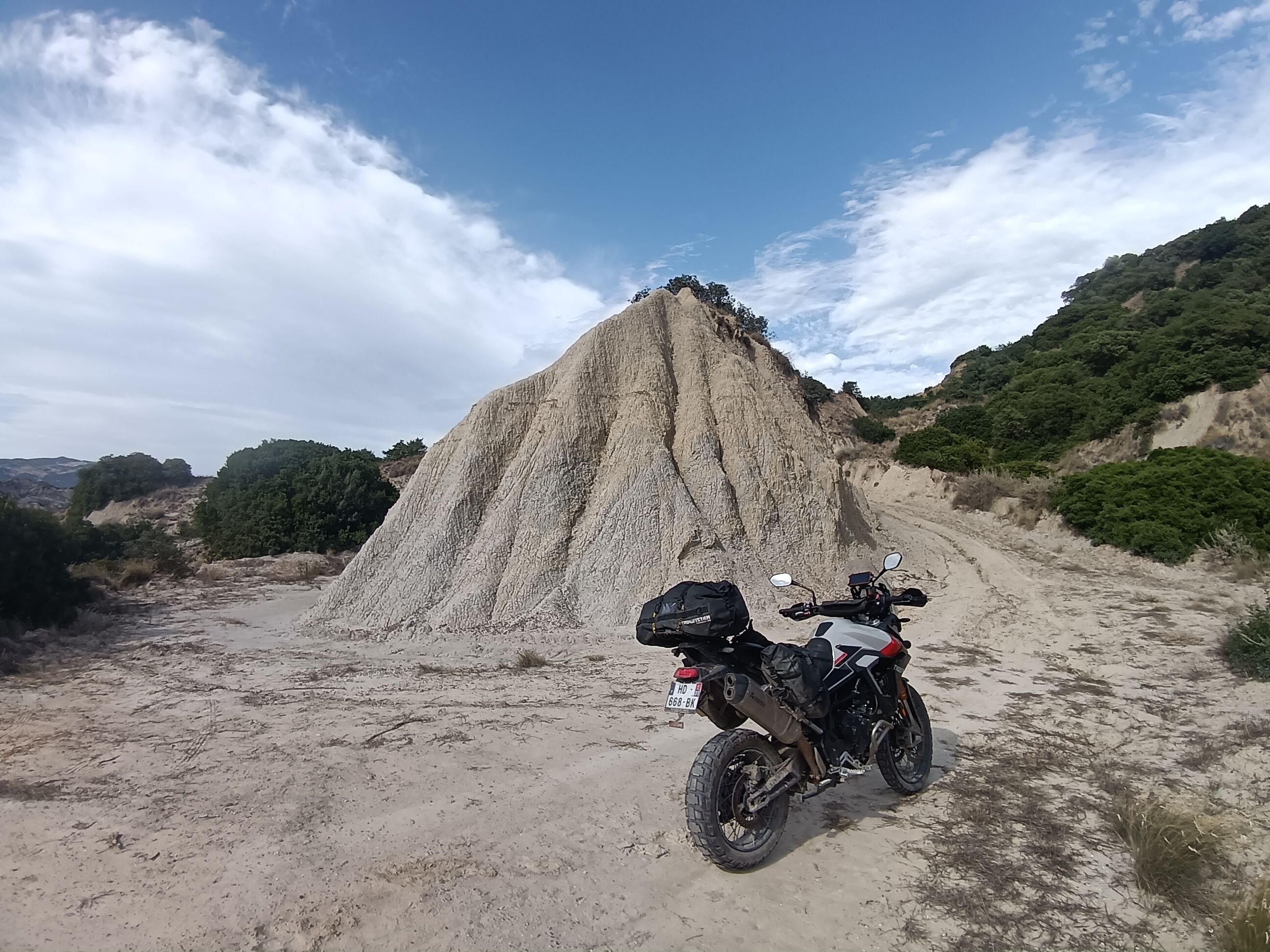 Dès 5h30 du matin, en pleine mer, le soleil laisse apparaitre ses premières lueurs orangées sur les crêtes albanaises au loin, alors que l’on se rapproche des côtes italiennes du côté des Pouilles et du port de Brindisi. Débarquement à 9h, enfin, 10h, le temps que le ferry régurgite ces 200 poids lourds. Cap vers l’ouest, au milieu des trulli et masseria des « Puglia », jusqu’à la célèbre ville de Matera. Pas le temps d’aller visiter l’intérieur, au plus près de l’ensemble d’habitats troglodytiques. Mais je parviens à entrer dans les carrières par une piste qui m’amène juste en face, de l’autre côté du canyon, face à la basilique et l’ensemble de cette ville remontant au néolithique. Je découvre même que sous mes pieds, et sous la moto donc, il y a une grotte et une chapelle. Un lieu incroyable.