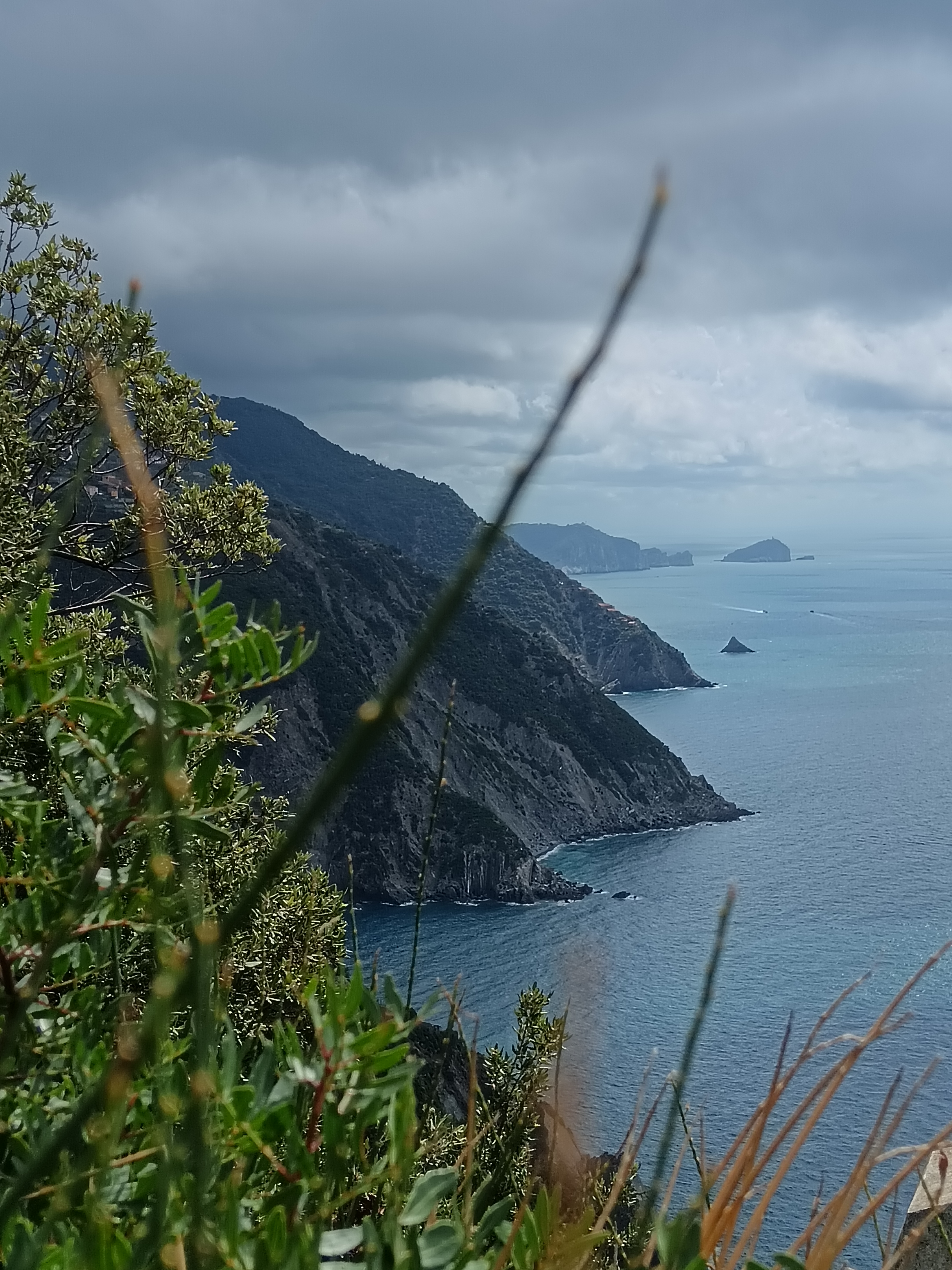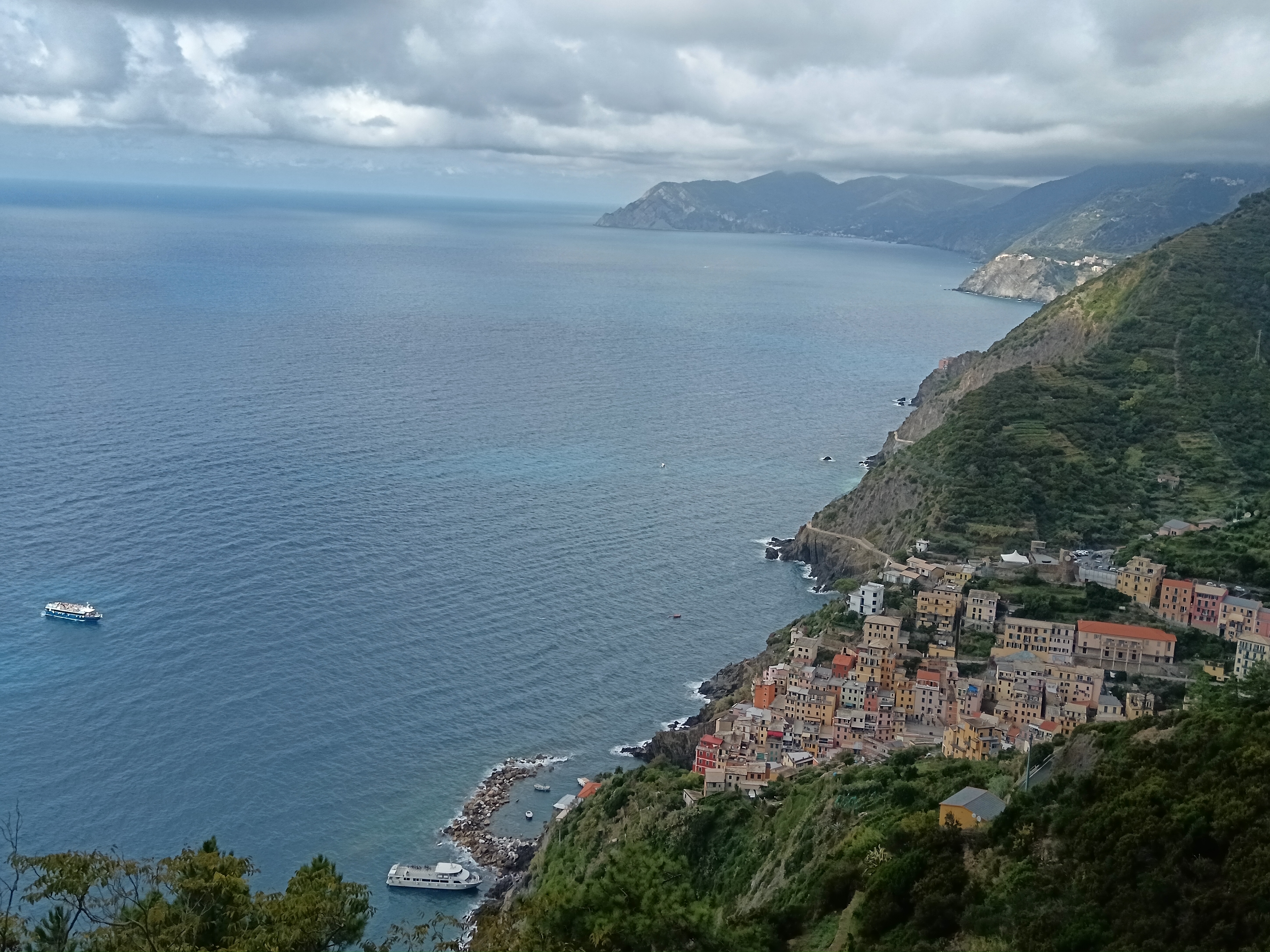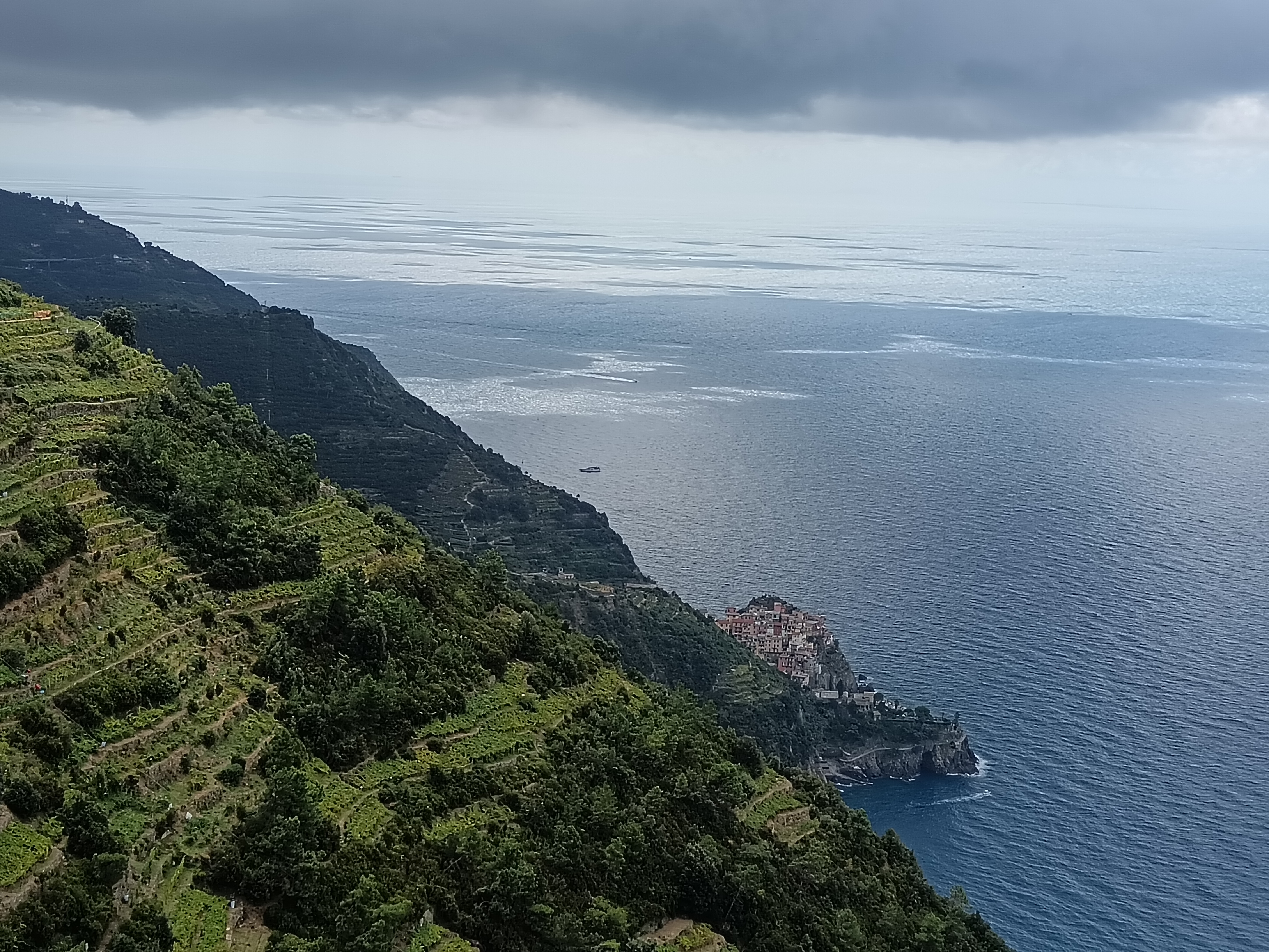 On poursuit jusqu’à La Spieza, pour arpenter Cinqueterre durant deux heures d’étroites routes de corniche, ouvrant des vues sur les célèbres villages en contrebas, en partie dans une brume maritime, en partie dans de beaux dégradés de bleus. Ce n’est pas la première fois que je passe par ici, mais je découvre pour la première fois une production viticole sur des pentes impressionnantes, les vignes étant équipées de crémaillères pour remonter la vendage sur la route. Etonnant.