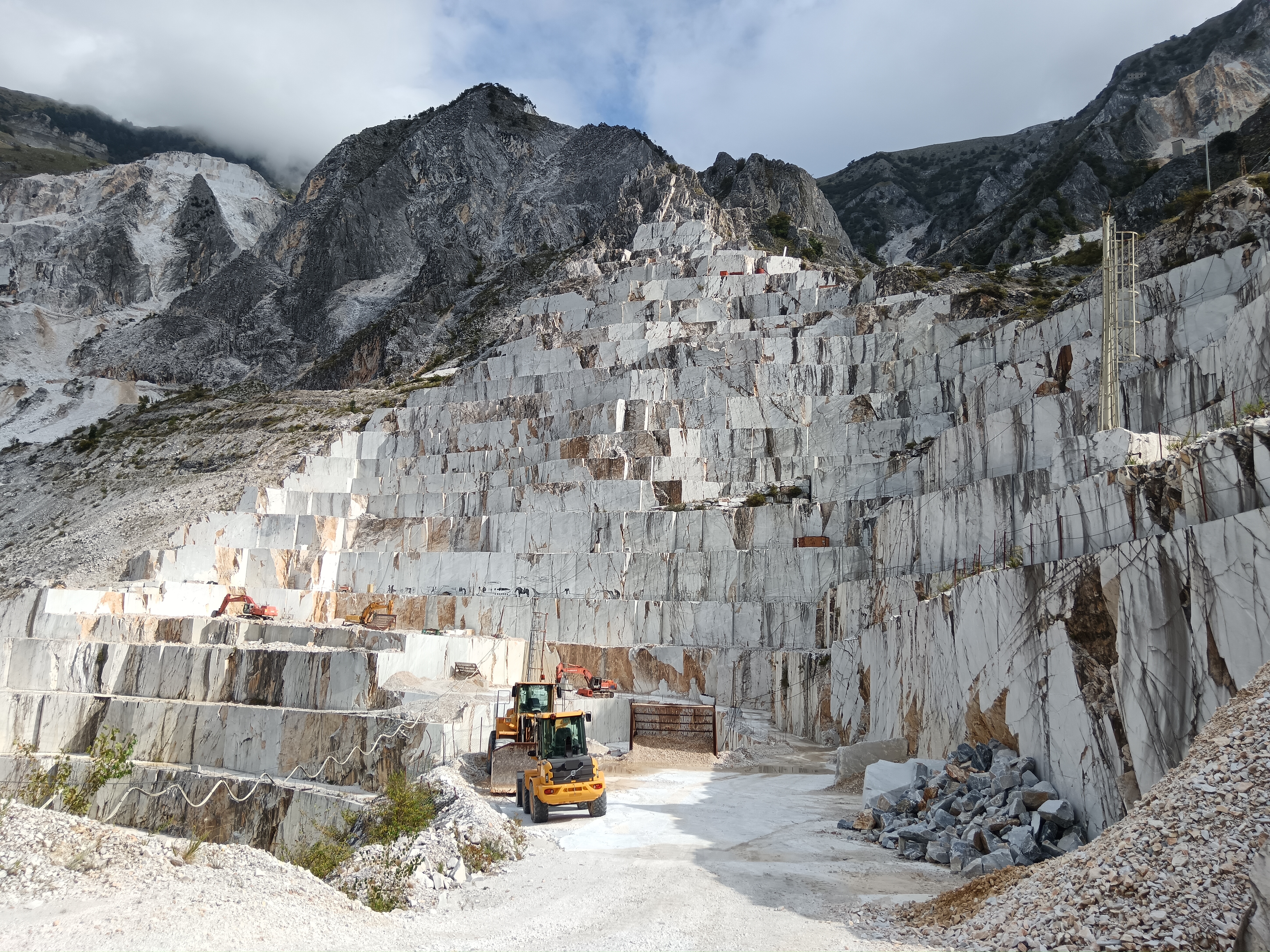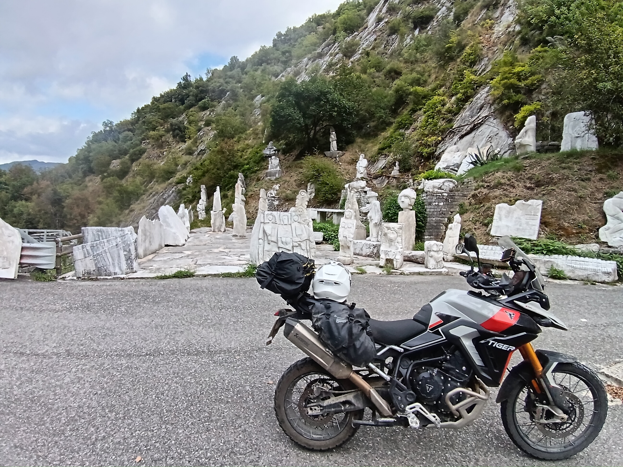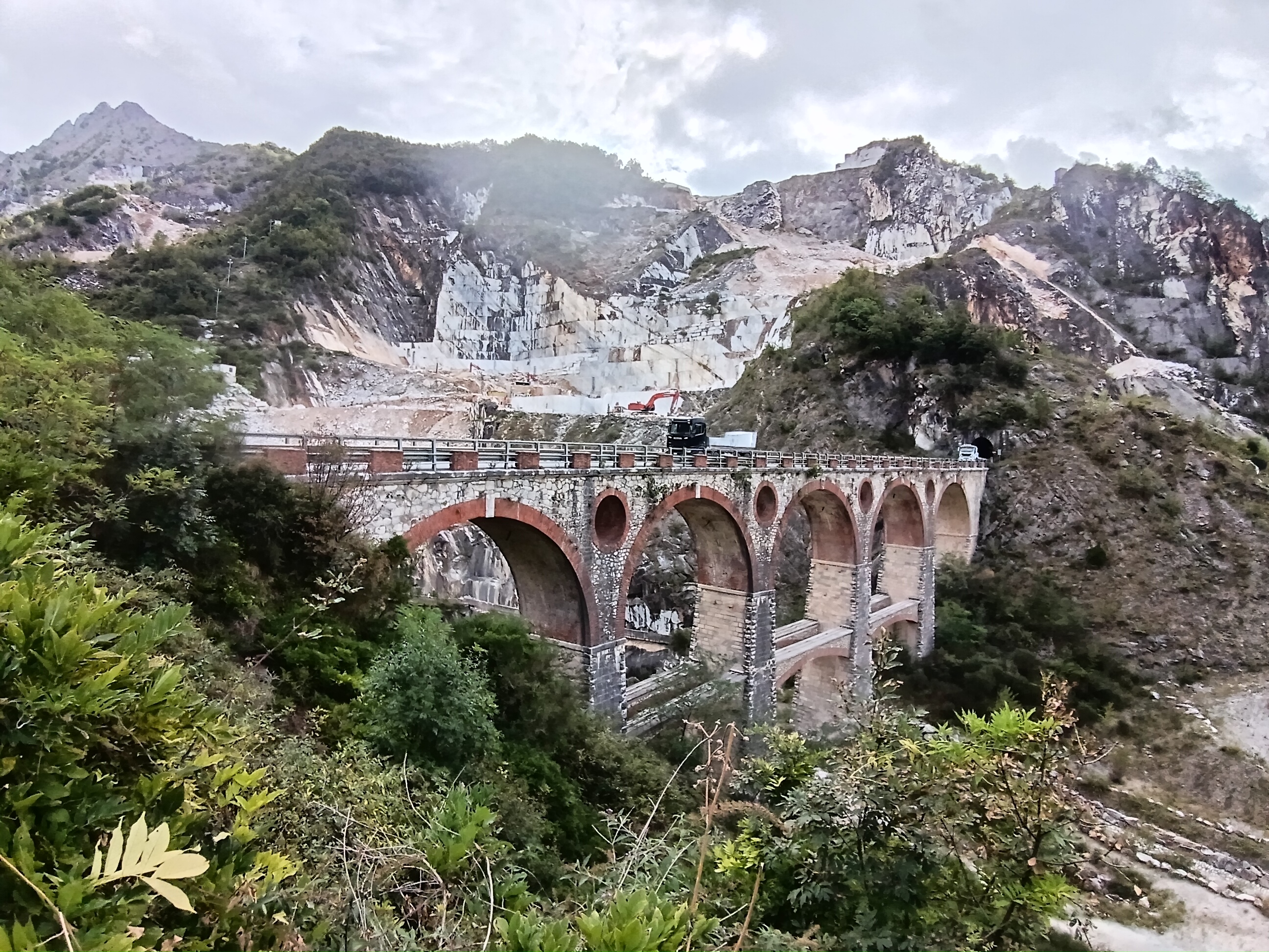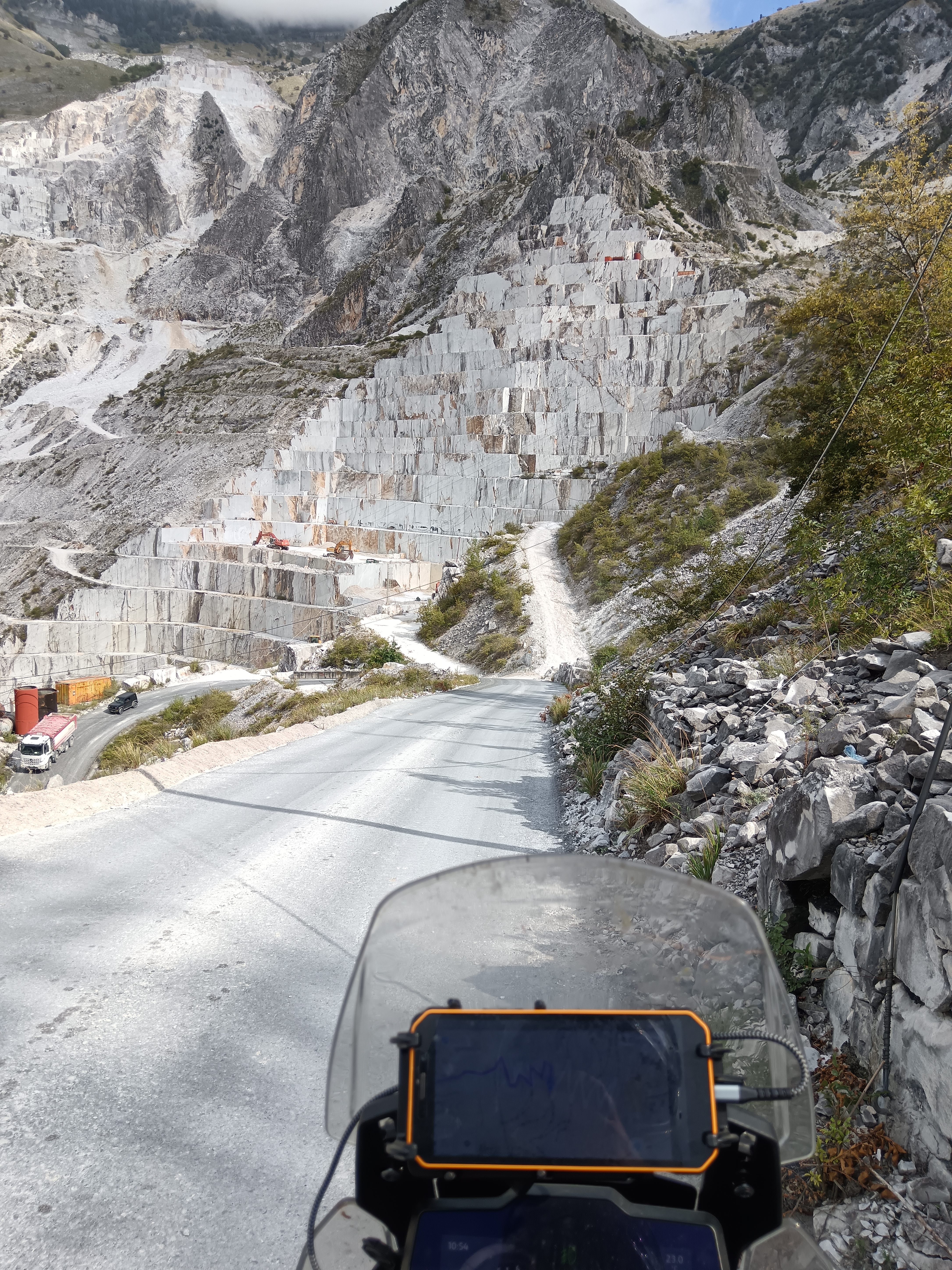 Petit déjeuner vue partielle sur tour (certains hôteliers ne trichent pas sur leur annonce). On démarre en longeant la côte, avec un premier objectif, lot de consolation de mon retour blessé d’Albanie deux ans auparavant : les carrières de marbre de Carrara. Des carrières de marbre blanc abruptes, à flanc de montagnes surplombant la côte, ou Michelangelo trouvait sa matière première, tout certainement comme Bernard Arnault la trouve encore aujourd’hui pour sa salle de bain. Un ballet de camion à travers d’étroits tunnels, des routes très pentues pour accéder au sommet des carrières. Evidemment, peu regardant des panneaux, on m’a poliment demandé de rebrousser chemin plus bas, car j’étais sur des voies d’accès non autorisées. Peu importe, c’était tout simplement un grand moment.